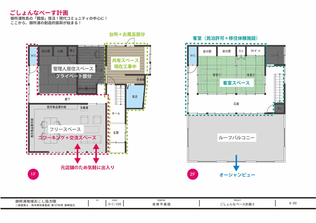 2023/03/07 11:36「ごしょんなべーす(コワーキングスペース)」|はじめに|2022年9月末の工事完了予定が、2023年2月末となってしまいました。プロジェクト進行が遅れてしまい、応援してくださった方や楽しみにされていた方には大変ご迷惑おかけいたしました。申し訳ございません。着実に一歩ずつ進んでいった結果、ようやく完成いたしましたのでご報告させていただきます。|プロジェクト概要|この事業では、12年間空き家だった店舗付き住宅をリノベーションして、1Fをコワーキングスペースに、2Fを宿泊スペースにしました。この施設を滞在と活動の拠点にして、利用者の御所浦滞在をアクティブかつリフレッシュできるような場所を目指します。ほかにも地域住民の交流拠点としての機能も充実させ、持続可能な地域づくりにも貢献したいです。|施設整備内容|Wi-Fi環境を整えた使用用途によってカスタムできるフレキシブルなスペースを計画します。デスク作業は4人~8人程度、イベント時には20人くらい入るレイアウトに変更できます。内観は、若者にも興味を持ってもらえるような躍動感ある意匠のインテリアで構成し、土足で気軽に入れるスタイルを採用し、気軽に立ち寄れるようなパブリック要素を高めました。2Fは宿になっているため、ワーケーションに最適な施設です。|利用条件について(R5年度)|① 天草+御所浦が好きな人② 協調性のある人|利用料金について(R5年度)|・個人利用:基本無料・貸切利用:応相談|ネーミングについて|もともと、一年以上前から仮称で使っていた「ごしょんなべーす」という施設名でしたが、Aoi yado同様に公募しようと思っていました。しかし、「牛深BASE」と「NAKAMURABASE」というお互い知らずにBASE(ベース)という名前を使った施設ができていることを知り、「よし!開き直って天草中にBASE(ベース)を作ろう!」という思いが芽生え始めました。「BASE(ベース)」とは、土台・基礎・基地のことを意味する英語表現です。地域コミュニティのBASE(ベース)になるように、この場所を運営していきます。|お問い合わせ先(R5年度)|管理人:くわさき電 話:080-4280-5853―――――――――――――――Special Thanks:勇志国際高等学校※令和4年度(2022年度)地域づくり夢チャレンジ推進補助金※2022年campfireクラウドファンディングによるプロジェクト:91人の支援者より1,219,000円の支援をいただきました。本当にありがとうございます!返礼品のお渡しが遅れて申し訳ありません。これより順次お送りいたしますのでもうしばらくお待ちください。――――――――――――――― もっと見る