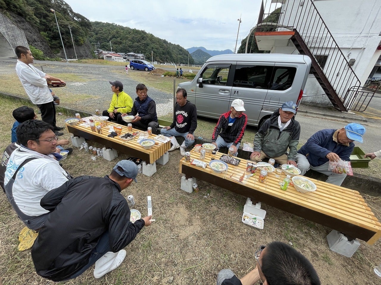 ・地域作業の終わりみんなで椅子をテーブルにして宴会が行われる。