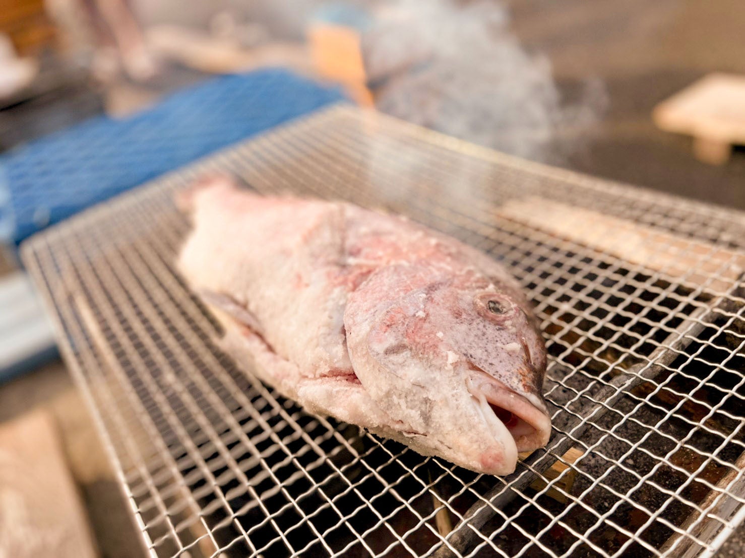 キャンプ地の御所浦ではタイの養殖が盛んで、テストキャンプ当日も「タイの丸焼き」がドッカーンとメインに据えられました!