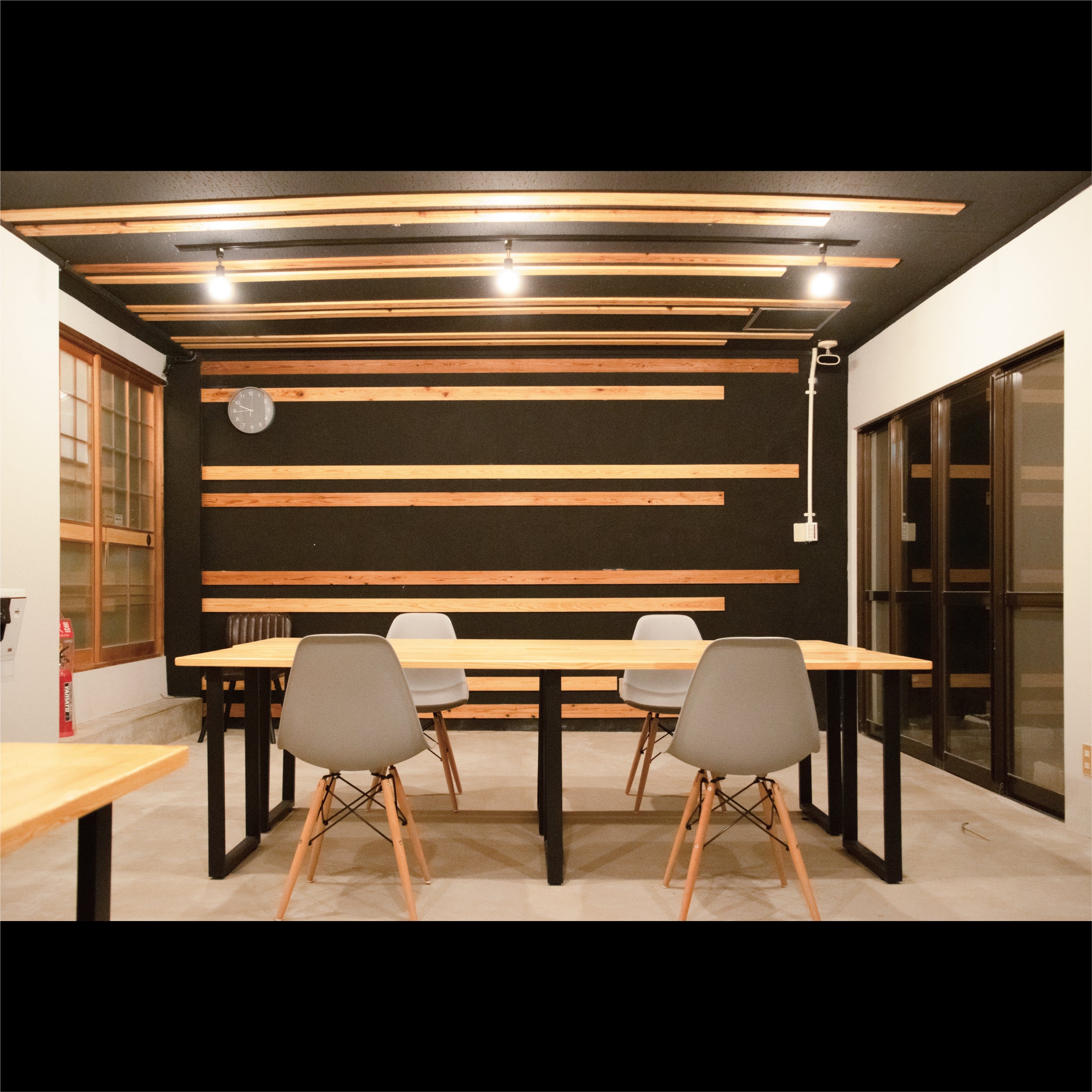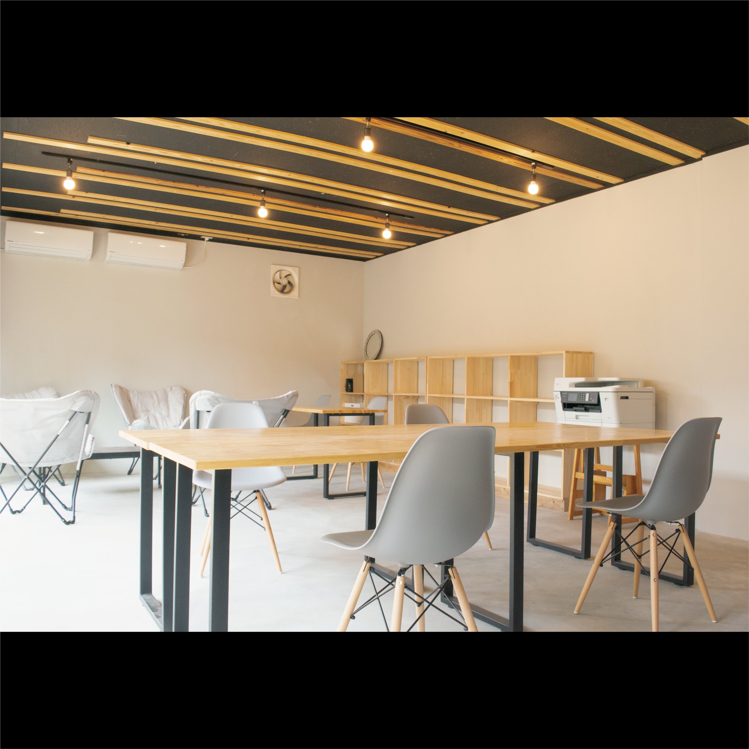 Wi-Fi環境を整えた使用用途によってカスタムできるフレキシブルなスペースを計画します。デスク作業は4人~8人程度、イベント時には20人くらい入るレイアウトに変更できます。