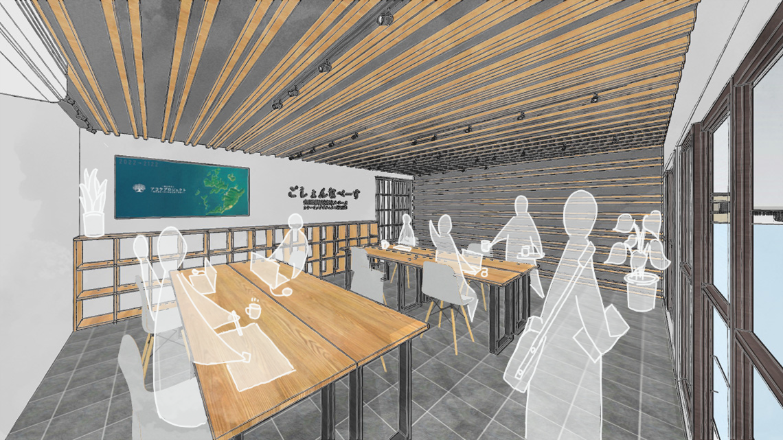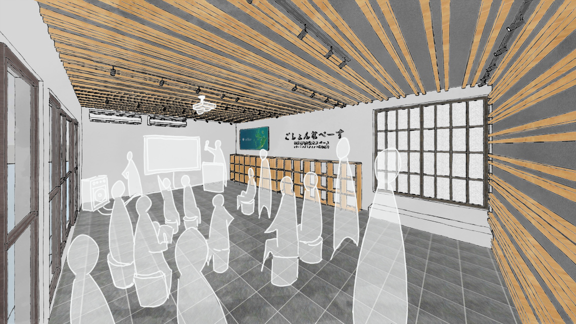 Wi-Fi環境を整えた使用用途によってカスタムできるフレキシブルなスペースを計画します。デスク作業は8人~10人程度、イベント時には20人くらい入るレイアウトに変更できます。例えば、子供たちと高齢者を呼んでe-sportsイベントを開催したり、映画などの上映会をしたり、地域の観光イベントにおける打合せ+打ち上げに活用したりなど様々な使われ方が予想されます。