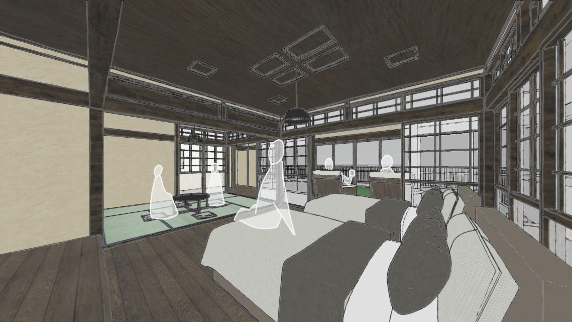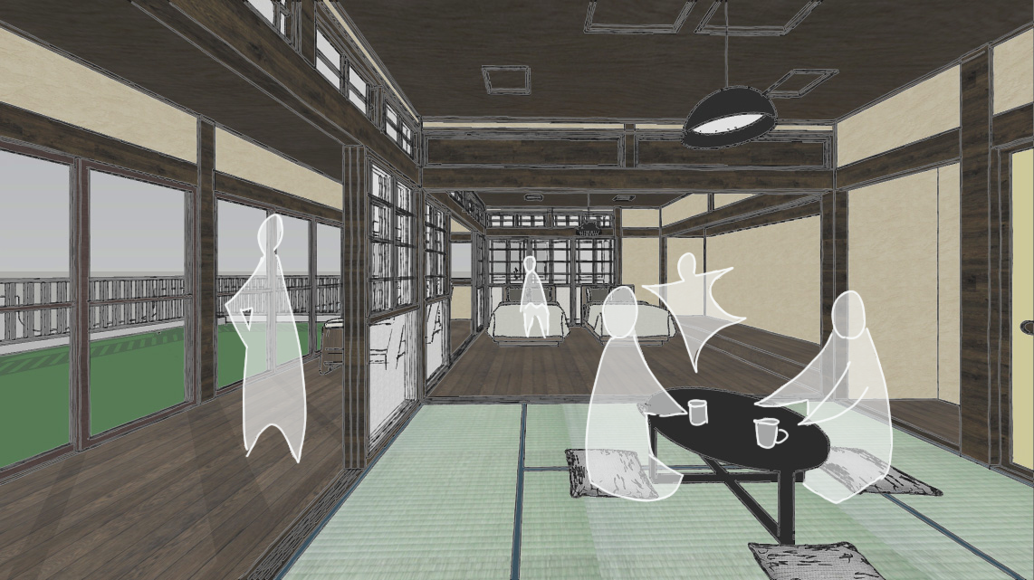 既存の間取りは大きく変更せず、当時の面影を残しながら表面を旅館らしい仕上げに変更する工事を計画しています。部屋ごとの区切りはなく、基本1組限定(最大6人まで)の宿泊施設にする予定です。