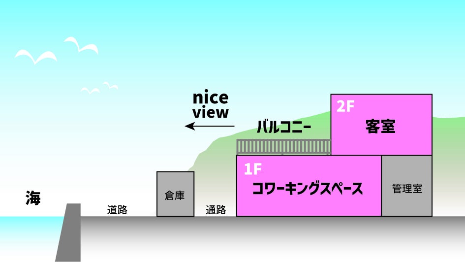 この施設を滞在と活動の拠点にして、利用者の御所浦滞在をアクティブかつリフレッシュできるような場所を目指します。平面プランと完成イメージは次の通りです。