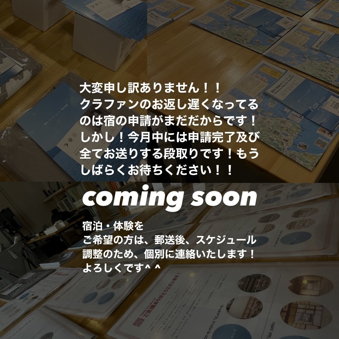 2023/05/17 08:27大変ご無沙汰しております。2023/05/17現在、宿の申請中でもうすぐプロジェクトが始まって10か月が経つ今、まだ返礼品をお送りできてないことお詫び申し上げます。様々な理由で当初よりオープンが遅れてしまいました。しかし、今月中に全て解決して6月には完全オープンできる段取りとなっております!それに合わせて、残り返礼品の発送準備を進めてますので、もうしばらくお待ちください!ご宿泊及び体験をご希望の方は、郵送後直接ご連絡差し上げますのでその旨よろしくお願い致します。プロジェクトは今後も責任もって推進していきますので、ご安心ください。御所浦地域振興のためこれからも頑張っていきます。今後とも変わらずよろしくお願い致します!一般社団法人 アコウプロジェクト代表理事 鍬崎智広 もっと見る