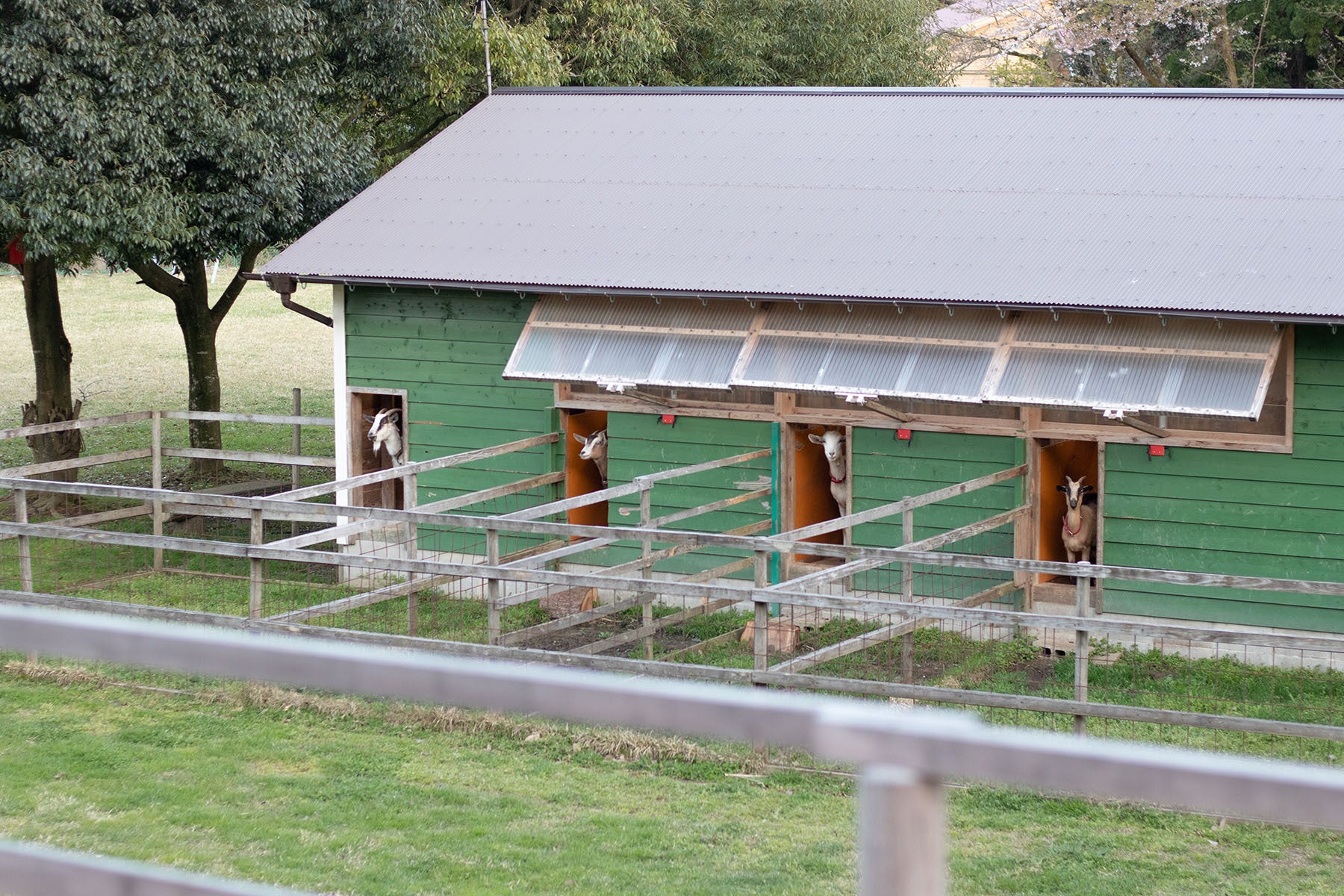 グリーンの小さくて可愛いヤギ小屋はヤギたちのために造られたおうちです。一部屋ずつパドックがあり、そこからこちらを覗くヤギがとても可愛らしいです。