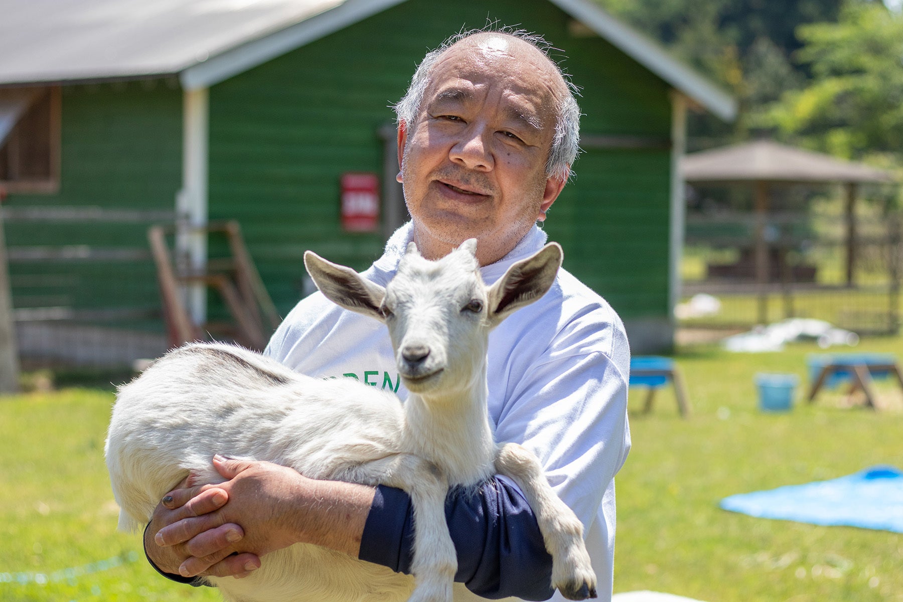 1978年に京都にある大学の経済学部を卒業し、その後保険会社へ入社。定年退職するまで、さまざまな部署で勤務し、中でも米国勤務時代に見た、大都市で猛烈に働きリタイア後は田舎へ移ってのんびり暮らす米国人のライフスタイルに感銘を受け、今から6年前に横浜から穴水町へ移住。ヤギの放牧と宿を始める。