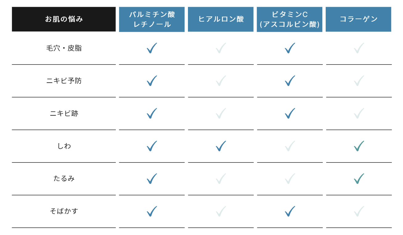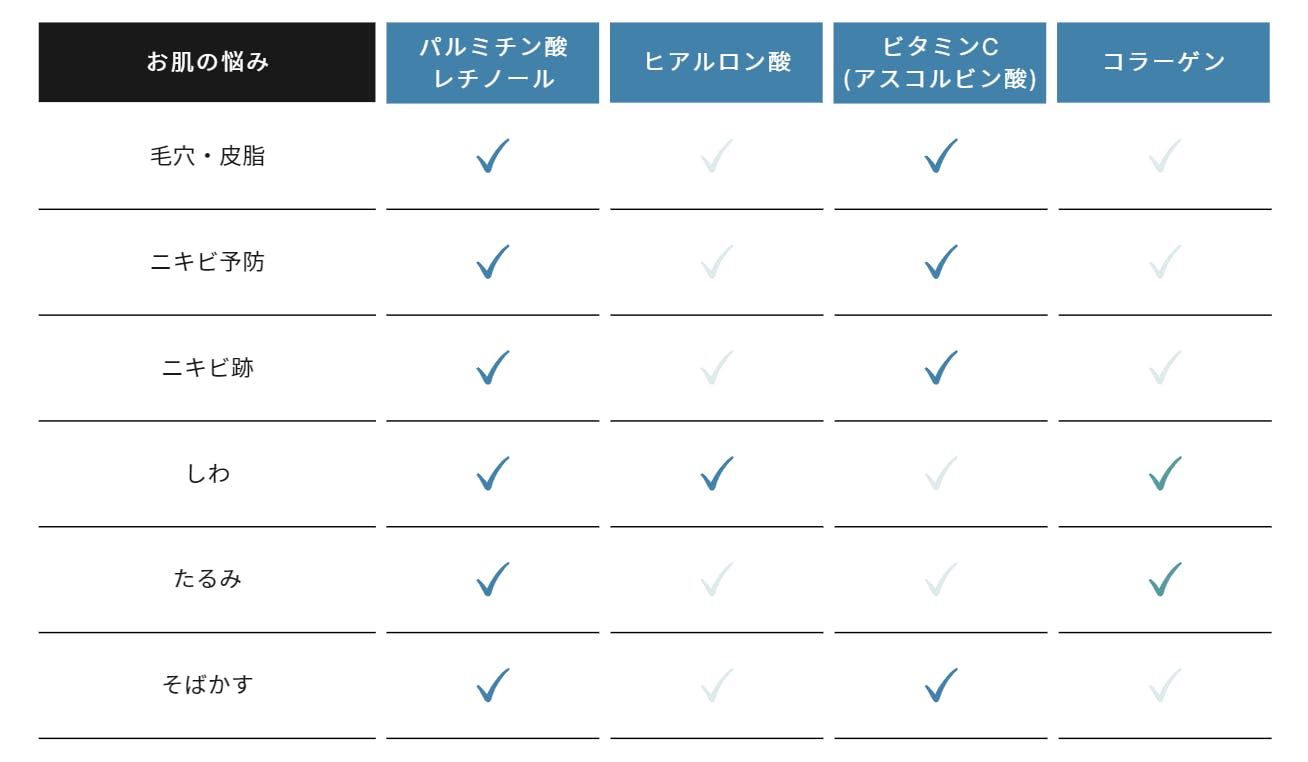 世の中にある様々な成分の中で、とにかくシンプルな使い勝手で効率的な美肌ケアを提供したいという想いから「パルミチン酸レチノール(整肌成分)」を導入して、商品を開発していきました。