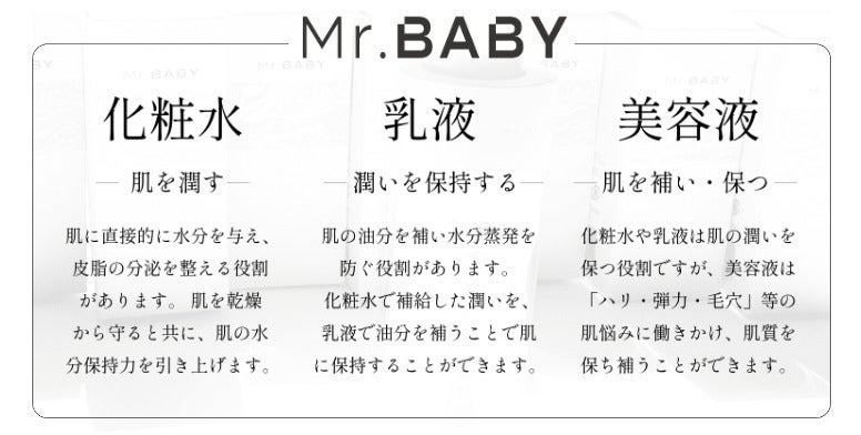 「Mr.BABY」はその想いを込めて、長年美容業界に従事してきた男性4名で立ち上げたメンズ専用コスメブランドです。