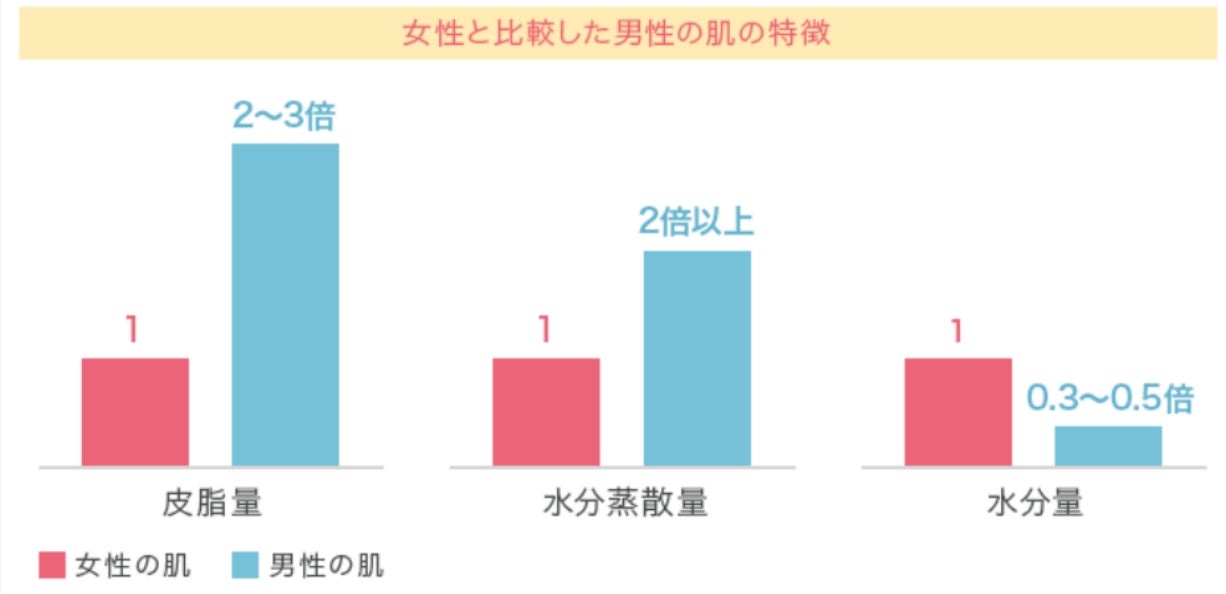 女性の肌に比べて皮脂の分泌量が3倍ほど多いですが、その一方で保水力が女性より弱く、水分蒸散量は2倍以上。