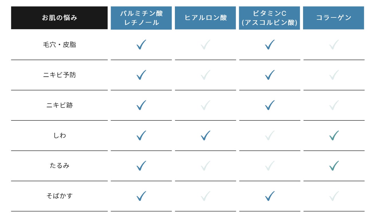 世の中にある様々な成分の中で、とにかくシンプルな使い勝手で効率的な美肌ケアを提供したいという想いから「パルミチン酸レチノール(整肌成分)」を導入して、商品を開発していきました。