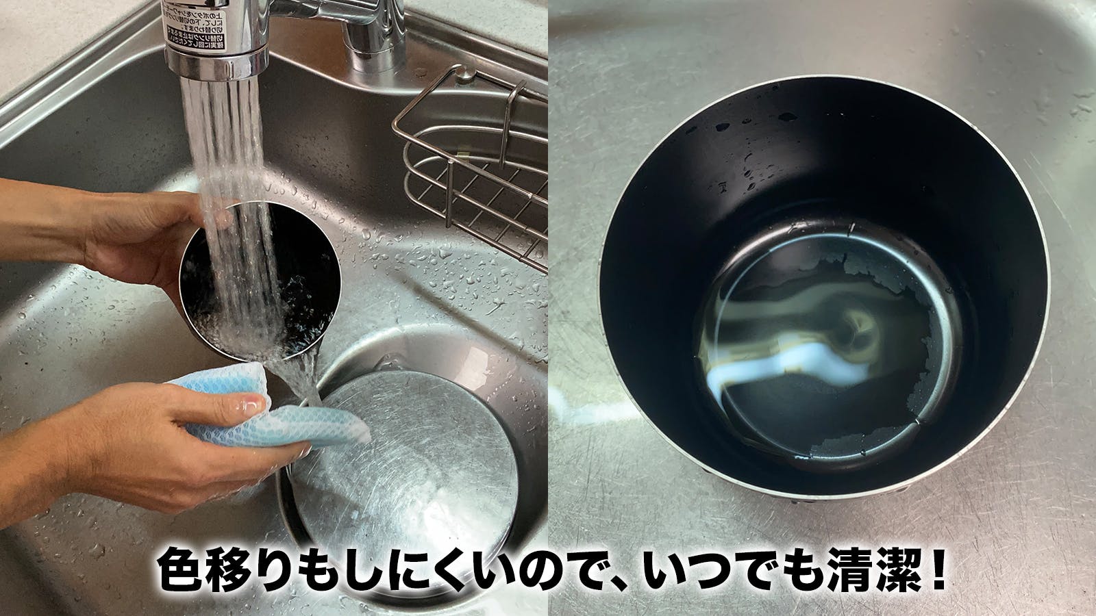 アルミは容器本体への色移りやニオイ移りがしにくいです。カレーを入れて保存した場合も、洗えばキレイになりますので、容器が黄色くなったりすることもありませんアルミやガラス等の金属の場合は「親水性」があるので、油汚れなどがつきにくいいんです。汚れにくさ、洗いやすさというのは何度も使う保存容器ではかなりのメリットです。