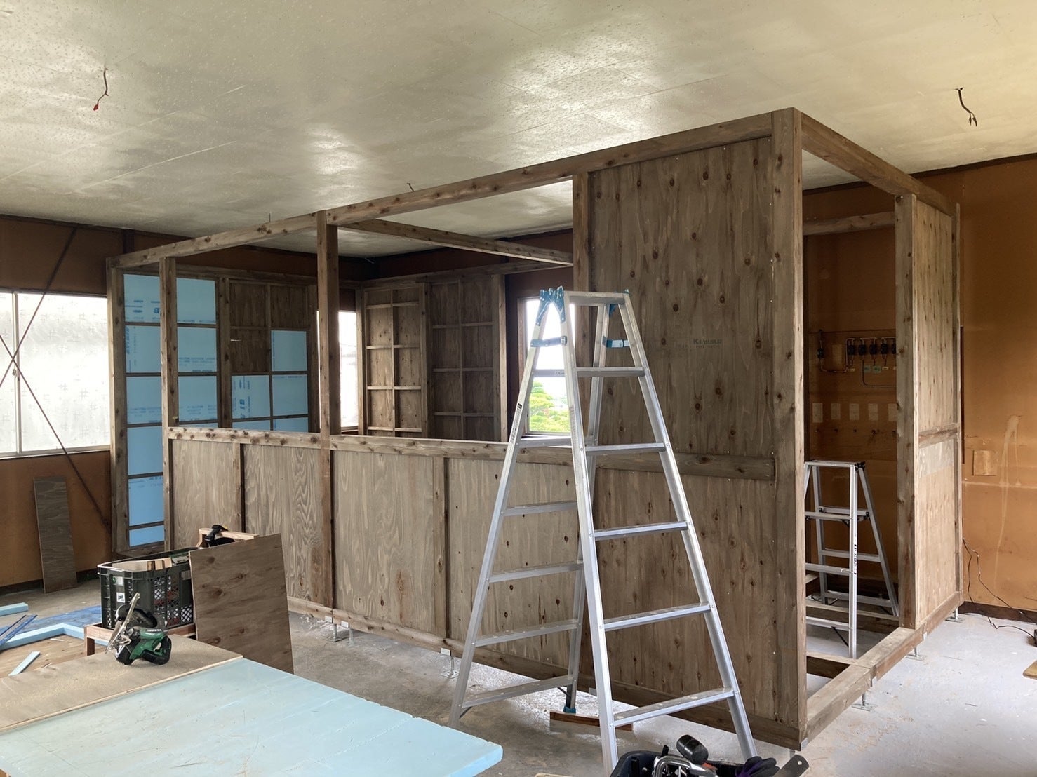 防腐剤塗り、断熱材カット&はめ込み、壁3ヵ所の作製、床の補強入れ、水道屋さん電気屋さんとやり取りなどなど