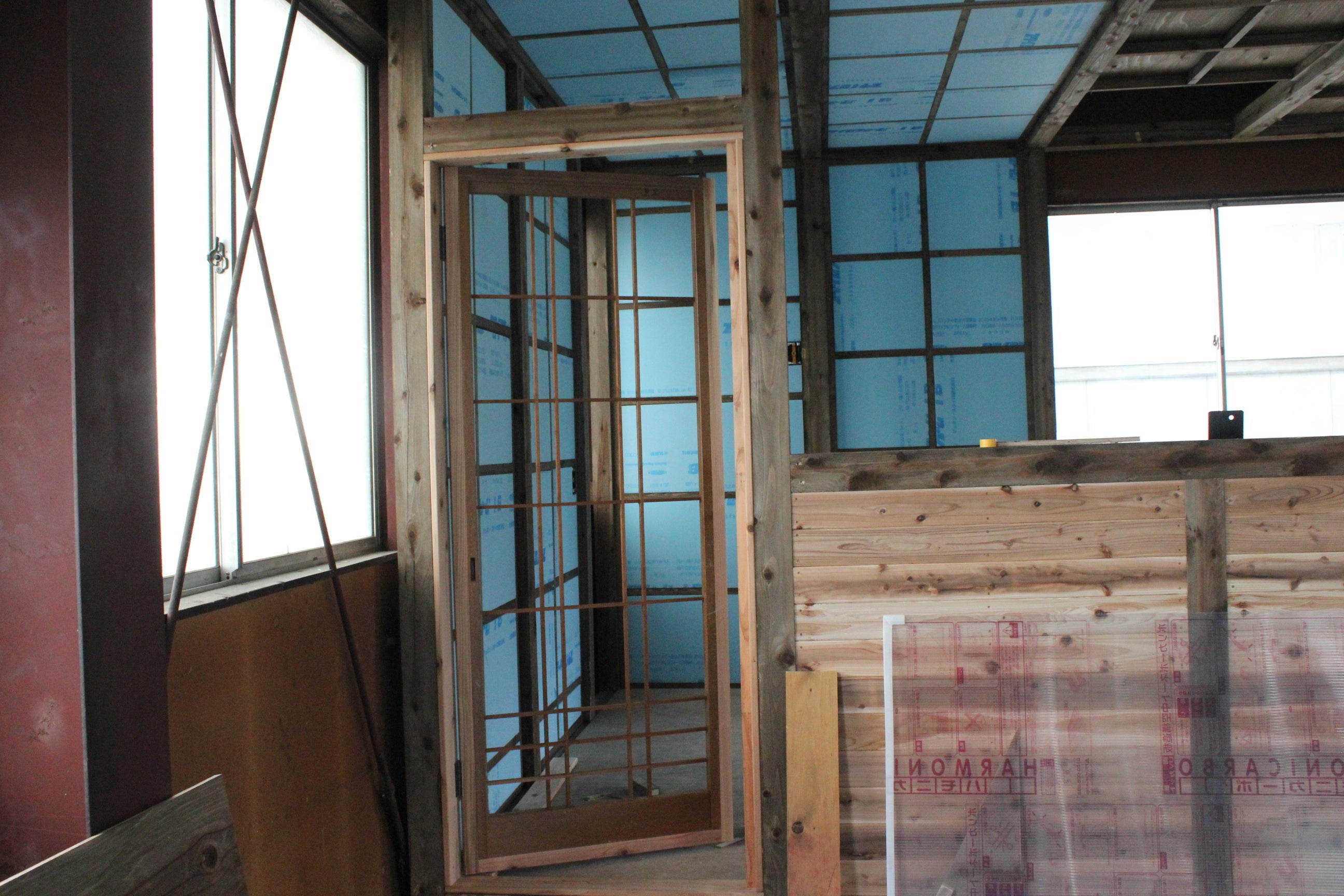 そして扉として使うのが、自宅にあった取ってしまっていらなくなった障子。そのまま合わせてみるとちょっと違和感がありましたが、障子紙を剥がすととってもかわいくなりました。この障子の周りに木材をつけてサイズを調整し、蝶板をつけて取り付けました。今は紙がなくスカスカですが、ここにポリカーボネートというプラスチックでできた透明の板をはろうと思っています。