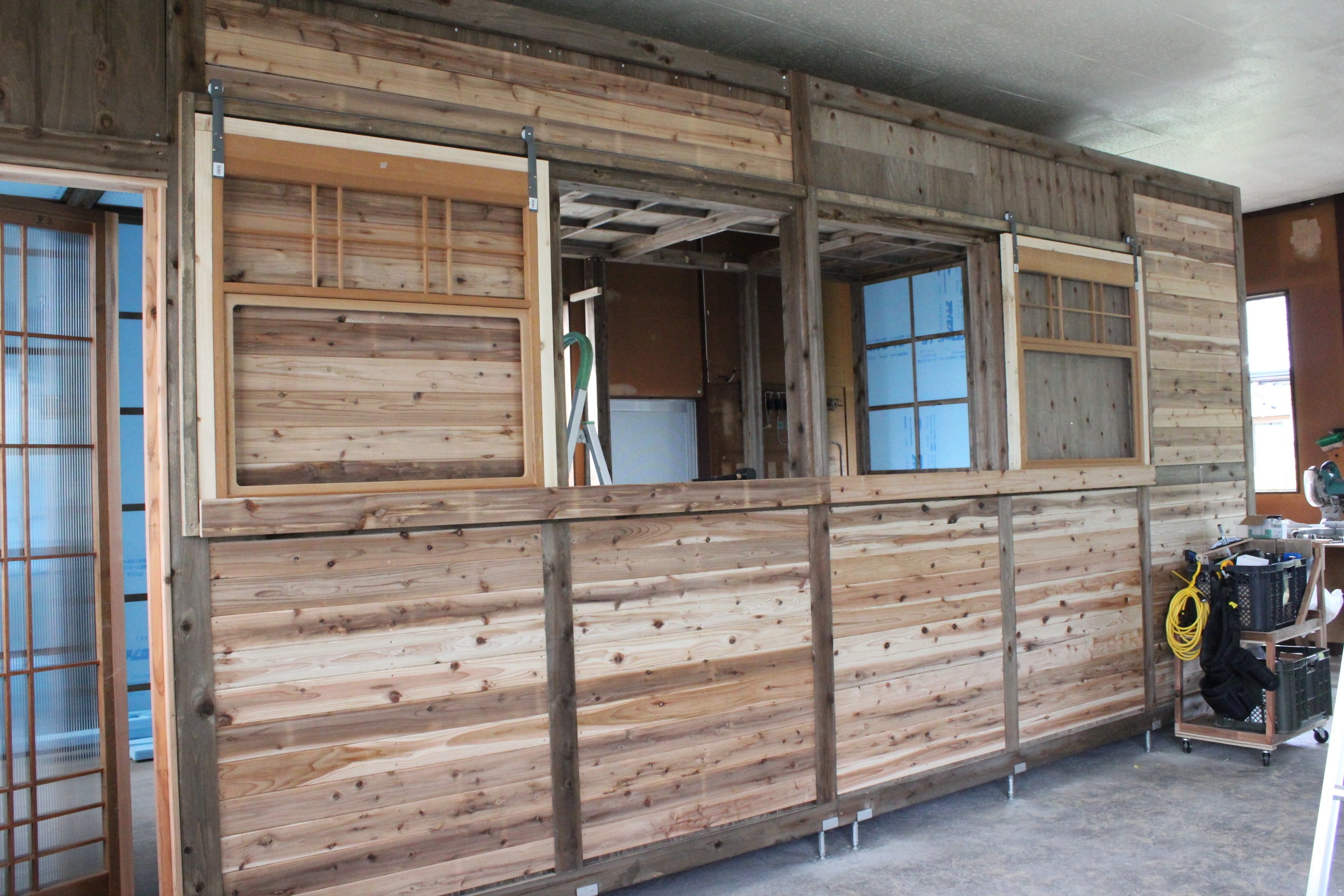 さて、お店はカウンター部分の引き戸が完成。木材を貼ってみたり色々試しましが、ちょっとデザインがイマイチだね…ということで、ひとまず仮でまたこの辺は材料を揃えて新たに作り直すことに。