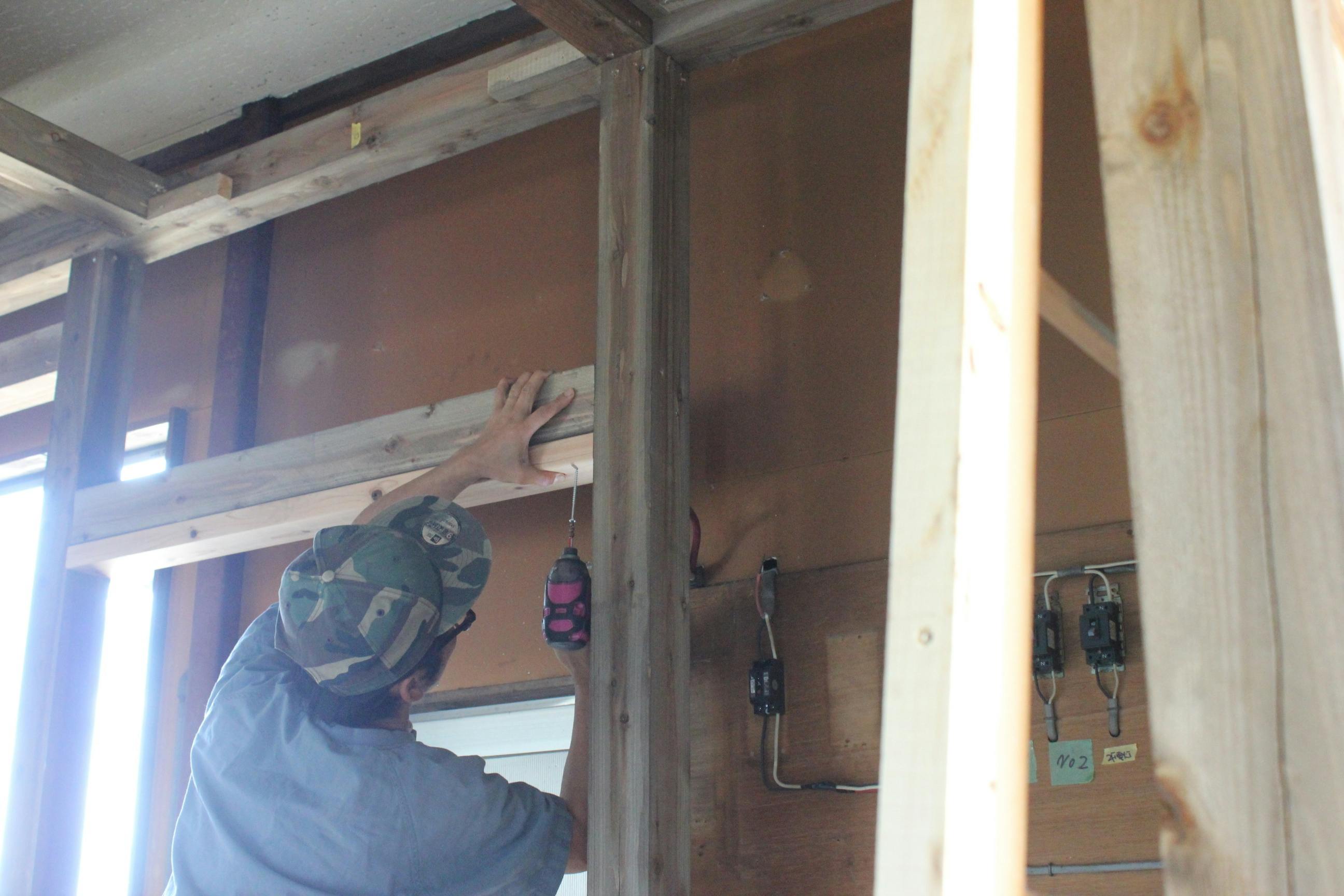 さて、今日はキッチンのおかって側の部分に取り掛かり始めました。窓部分の上の梁を取り付け。障子の障子紙を剥がし、ガラスを抜いて、枠の部分を少しカット。そして新たに枠を付け直します。