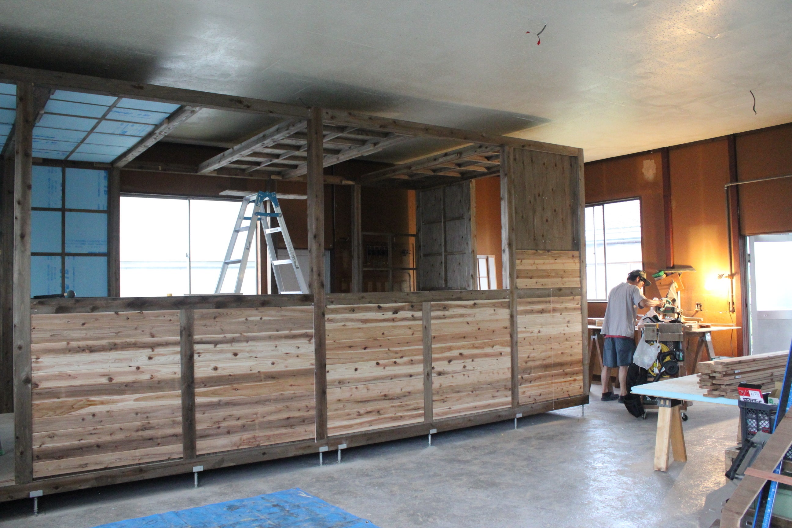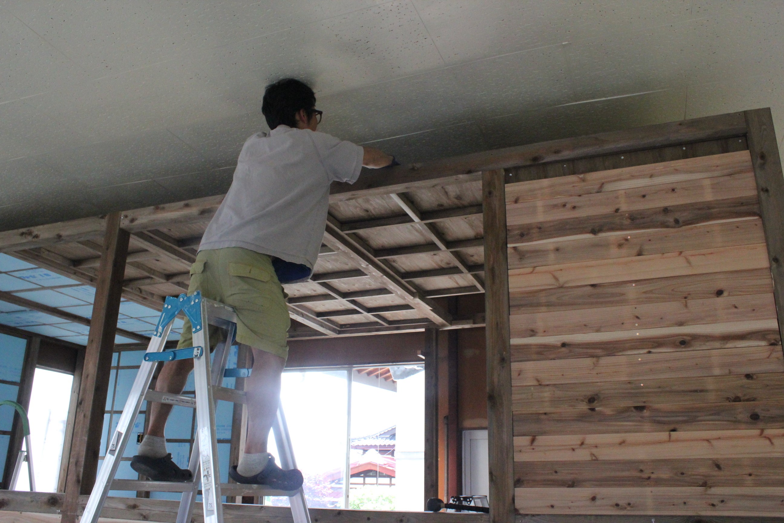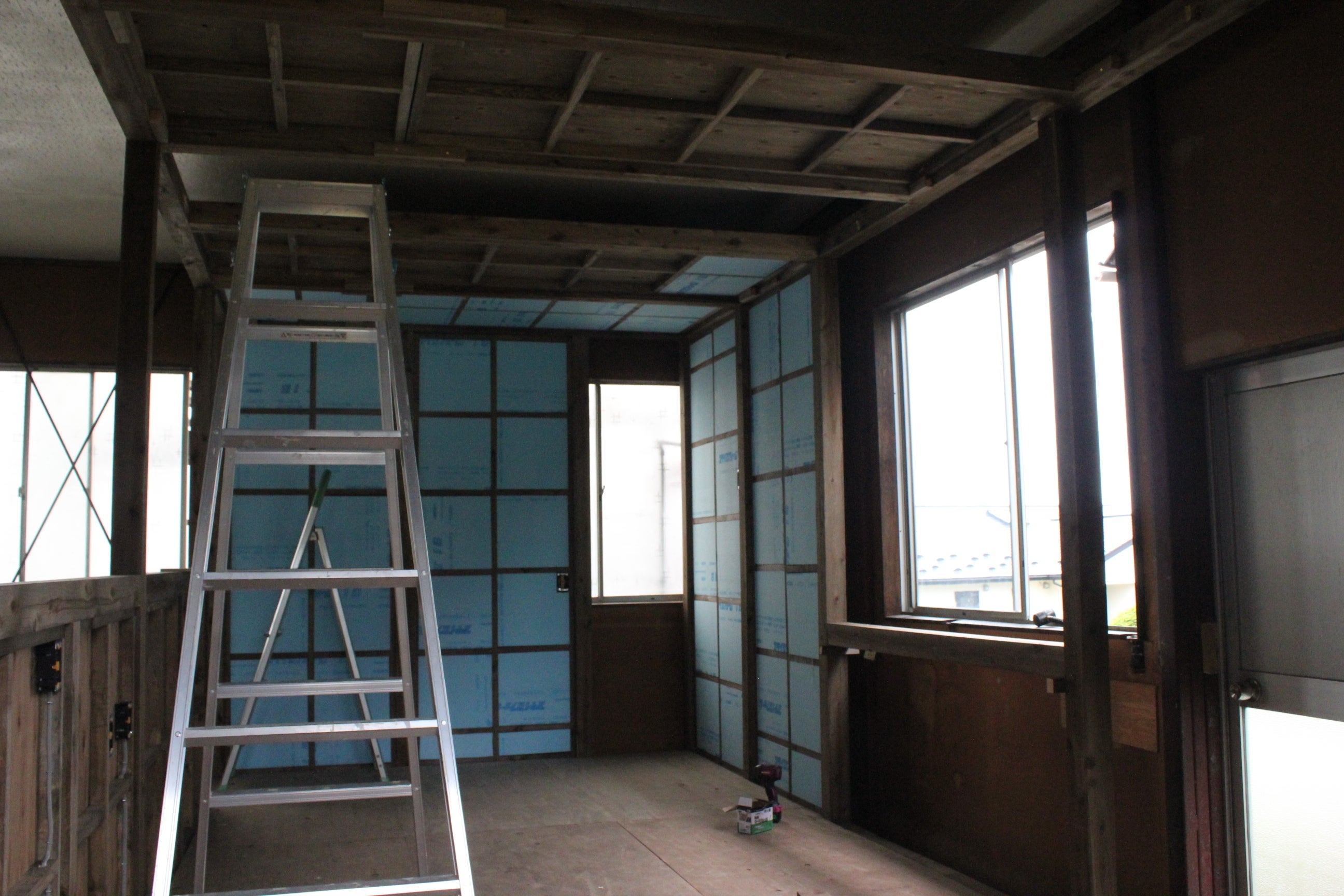 今日は朝までの雨が嘘のよう、梅雨が明けたかのような太陽の威力でした。湿気はあまりなく、暑く清々しい一日でした。そして畑熱に火がついた私はまた朝から畑のことであたまがいっぱい!今日は朝から一日畑作業をさせてもらいました。なので本日の工場は主人1人でしたが、なかなか進んでいました。水道工事、電気工事に支障がない部分はほとんど天井や壁は完成しました。残った部分はこれからの業者さんとの打ち合わせによって進めていくことになります。壁や天井については、断熱材を入れ終わったら石膏ボードをはったり、タイルをはったり、まだまだ多くの道のりがあります。天井はほぼ貼り終わり窓下部分の壁も完成窓はどうしても残して欲しかったので、広い窓が浮き上がってきてうれしかったです…!そしてこれからは、よくよく検討してからでないと進められない細かい作業に入っていきます。現在は頭を悩ませ中…。扉や、換気扇、ガス代周辺などなど。こちらもまだまだ道のりは長そうです。寸法をはかって切って作って乗せての繰り返しです畑の方は、大豆の種まき、オクラの補植、苗を育ててきたきゅうり、スイカ、バジル、紫とうがらし、甘長とうがらしの定植を行いました。そして畝を全体的に間引きや草を刈って重ねる作業を。あれもやりたい、これもやりたい…!といっぱいだった頭の中はどんどんスッキリしていきました。トマトと混植したバジル小さな小さなスイカの苗トマトもちょっとすっきり黒大豆。ここは大豆として収穫できるかな?これでしばらくは落ち着きそうです。明日からは断熱材カットをひたすら頑張ります!(あれ、昨日も言ってたかな??)