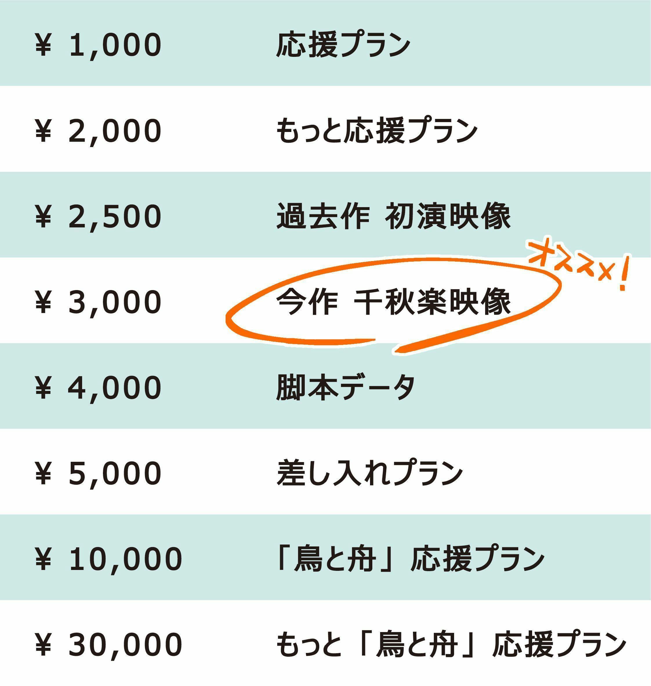 ・プラン選択時、備考欄に「〇〇(俳優のお名前)宛」の記載をいただけましたら、ご支援額の40%をその方への出演料としてお渡しします。残りの60%の内、17%(手数料12%+決済手数料5%)+税 はCAMPFIREに支払われ、約40%を劇団の活動に利用します。(※差し入れプラン、劇団応援プランは除かれます)