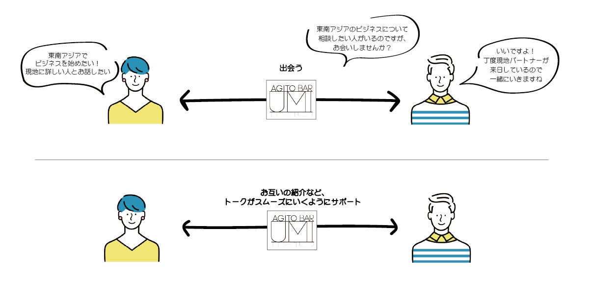 それによってバーには様々な業種・職種の人物データが蓄積され、ご紹介したい「人物」「案件」などが生まれると、UMIがデータバンクからベストな人物同士をつなぎます。