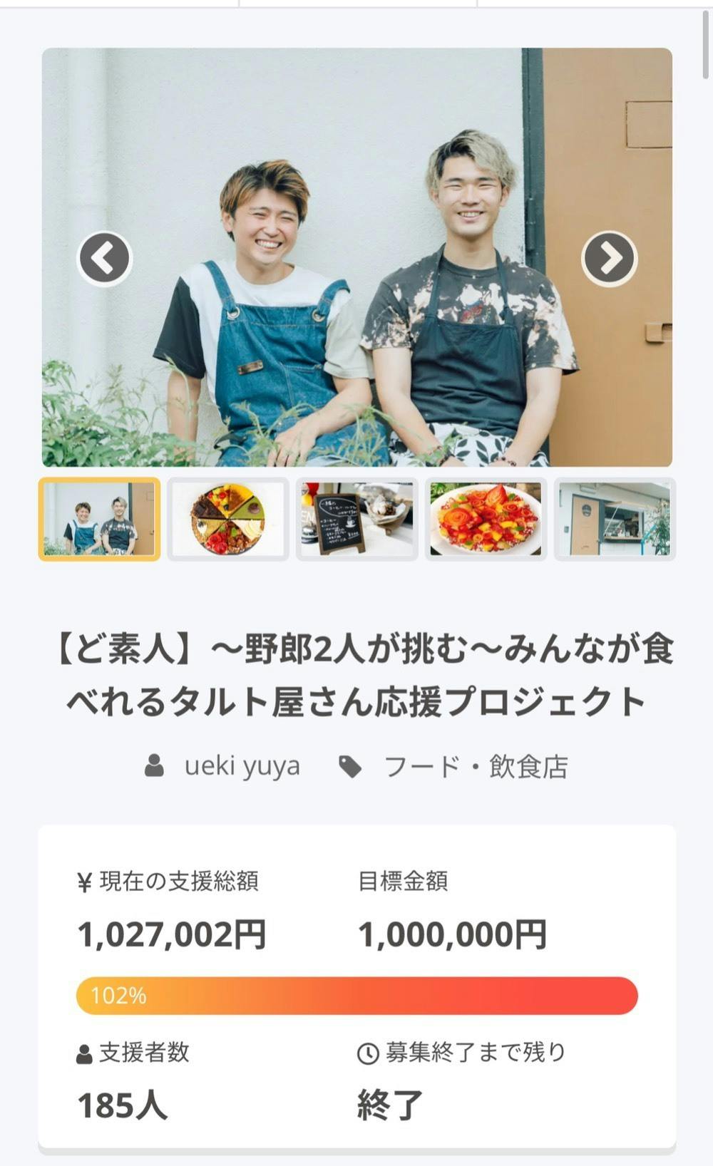 2022/06/21 15:18どうも皆様こんにちは!筋肉タルト坊やこと植木雄耶(うえきゆうや)です。本題に入る前にご支援拡散していただきまして、本当にありがとうございます。現状5%に到達いたしましたのも、皆様のおかげです。さらなる精進してまいりたいと思います。そして!クラウドファンディングスタートして!今日で!5日目!現状!5%‼正直力不足を感じておりますが、、、地道に泥臭くこれからもやっていきます。1日10件DMを欠かすことなく続けて参ります。本日からリターンを一つ追加いたしまして、【ふっ筋カフェのスポンサー件】ふっ筋カフェの店内にお名前を掲載できます!!sizeは3cm×10cm程度です。一口5000円となっております。是非こちらもご活用よろしくお願いいたします。【残り40日間】やることを淡々とやって!達成を迎えたいと思います。また近いうちに活動報告いたしますね!!よろしくお願いいたします! もっと見る