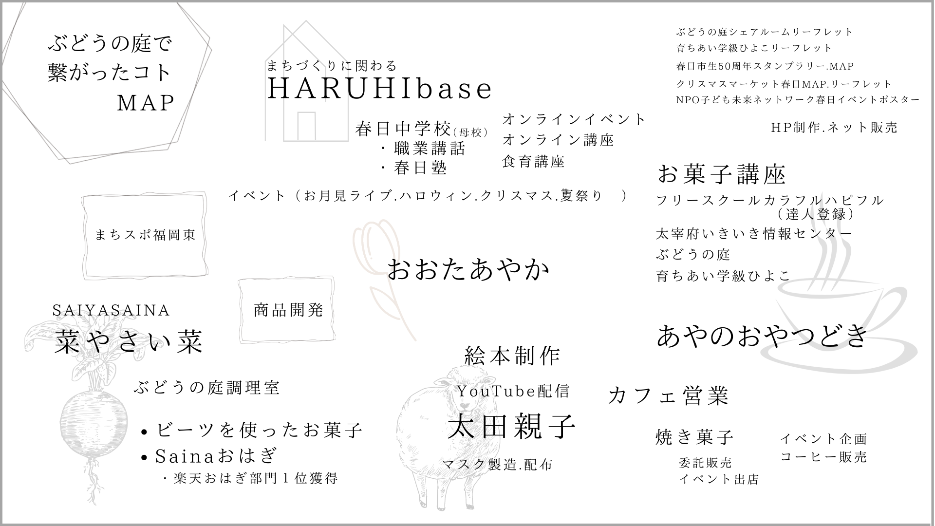 大人と子どもの居場所作り、ご近所コミュニティを盛り上げる「HARUHI base」でイベントをしたり、「菜やさい菜saiyasaina」さんと商品開発をしたり(さいなおはぎ)、ぶどうの庭の「絵本」を作ったり。この1年間様々な活動をする中で、たくさんの人と出会いご縁をいただき、この度、六本松に古民家カフェをオープンします。