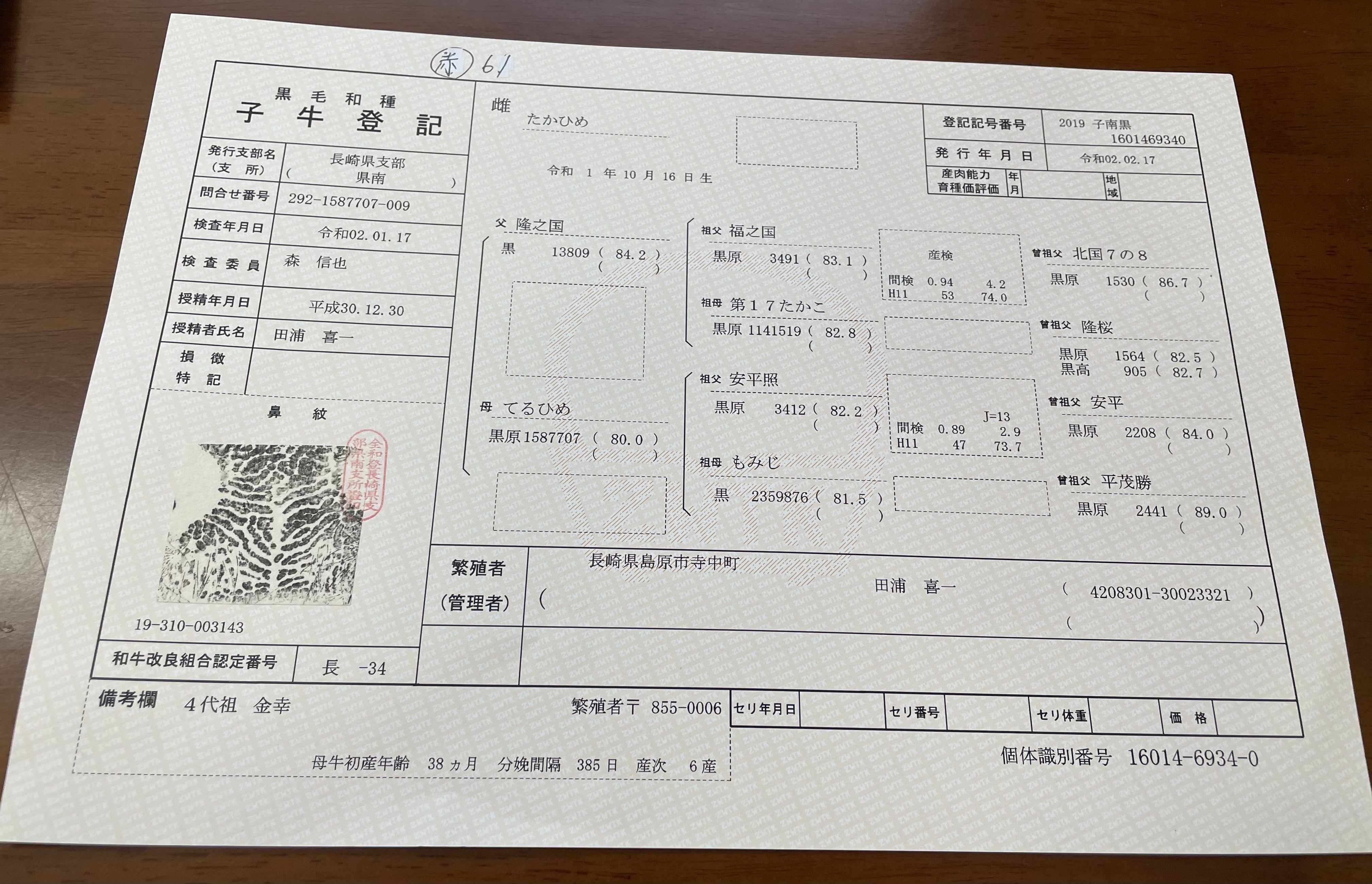 たかひめの子牛登記。ご覧下さいませ‼︎全国の牛さんはこうやって登録され全ての情報を登記されています。人と一緒。。。