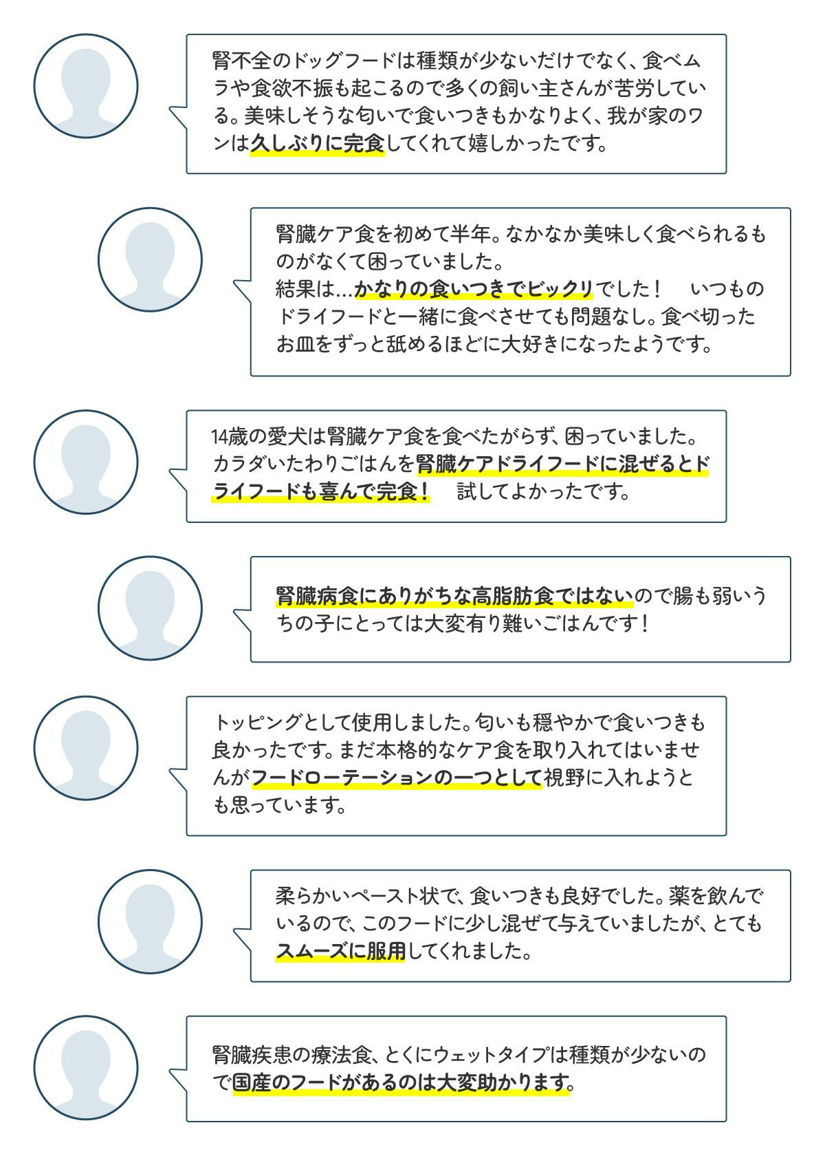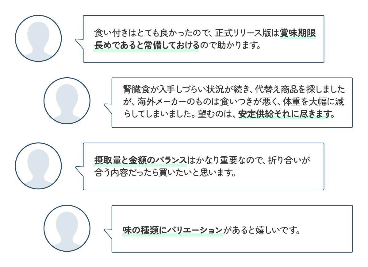先行モニターでの圧倒的な注文数から腎臓ケア食を優先して商品化いたしました。サンプルではその他にも肝臓ケア、皮膚ケア(アレルギーケア)、消化ケアも試作していました。「腎臓いたわりごはん」を安定的に供給できる環境を整えつつ、将来的にはバリエーションを増やしていければと考えています。