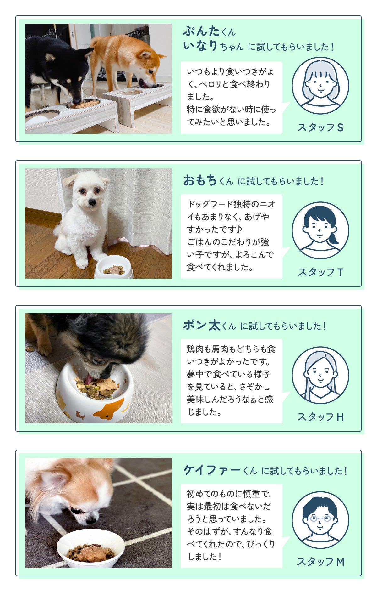A:鶏肉、馬肉各6袋の食いつきをお試しできるリターンをご用意しています。