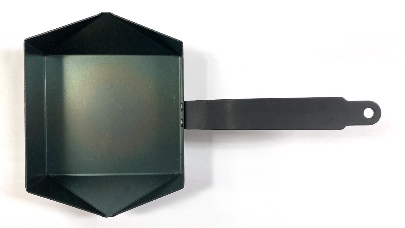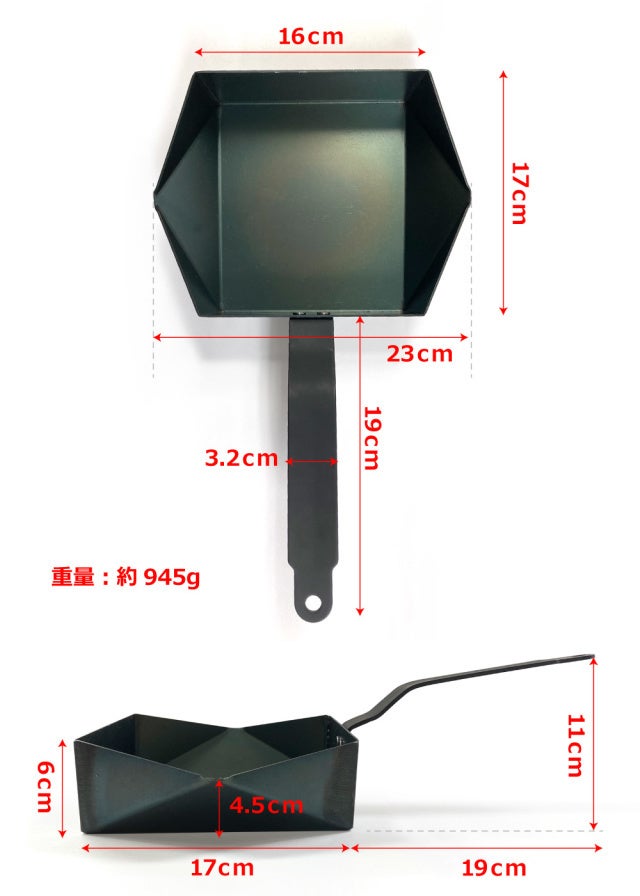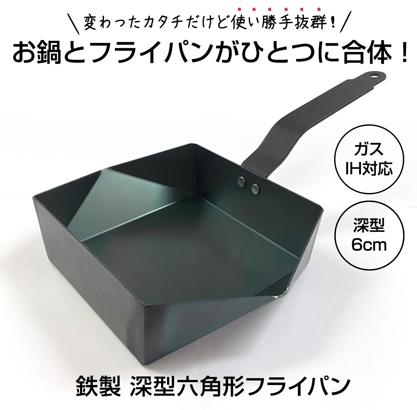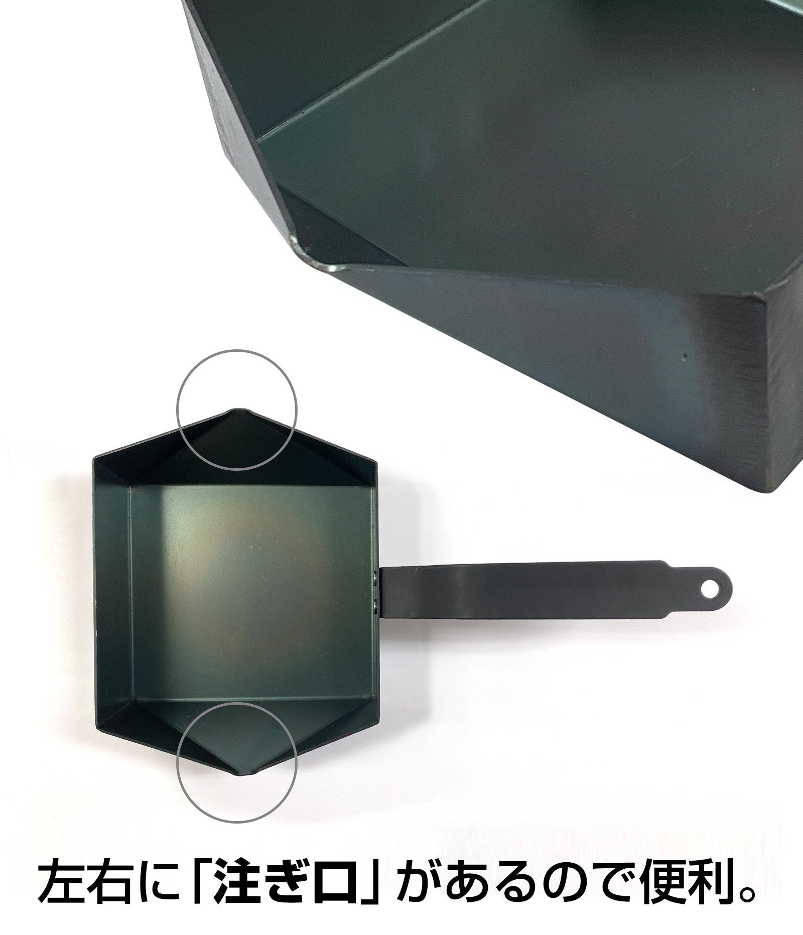フライパンとしては異例の六角形。(左右が注ぎ口になっています。)