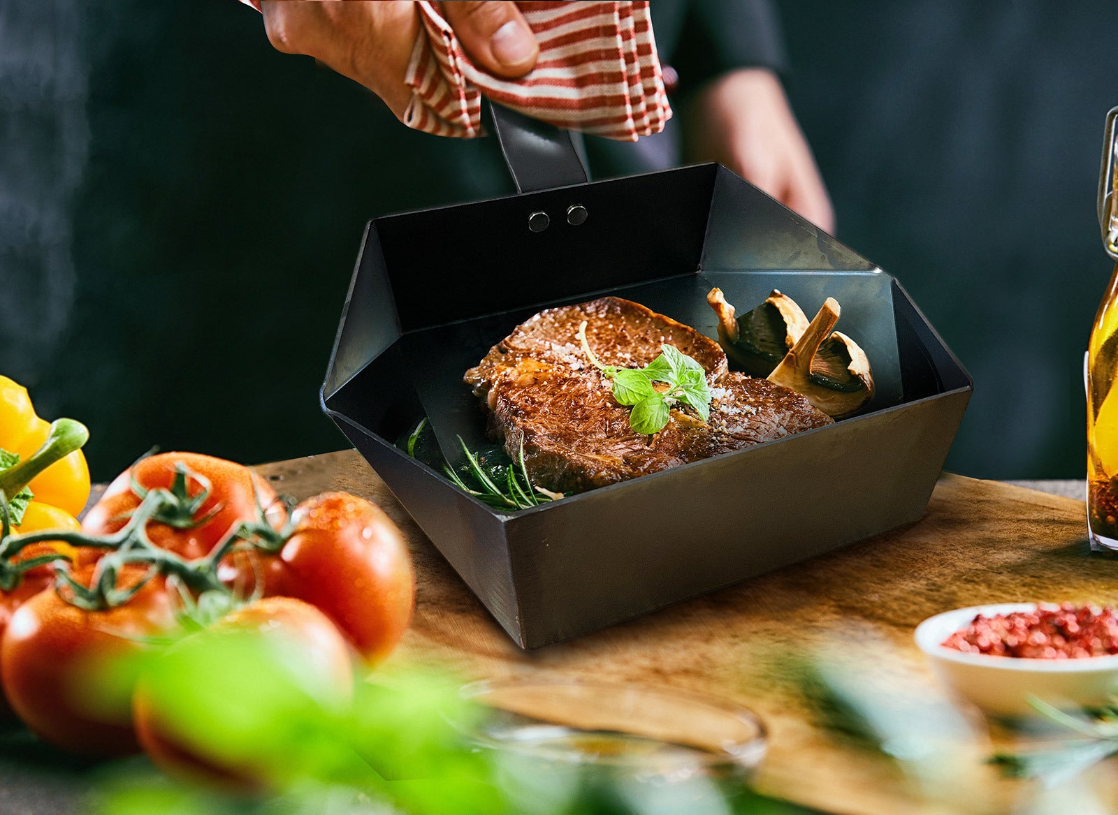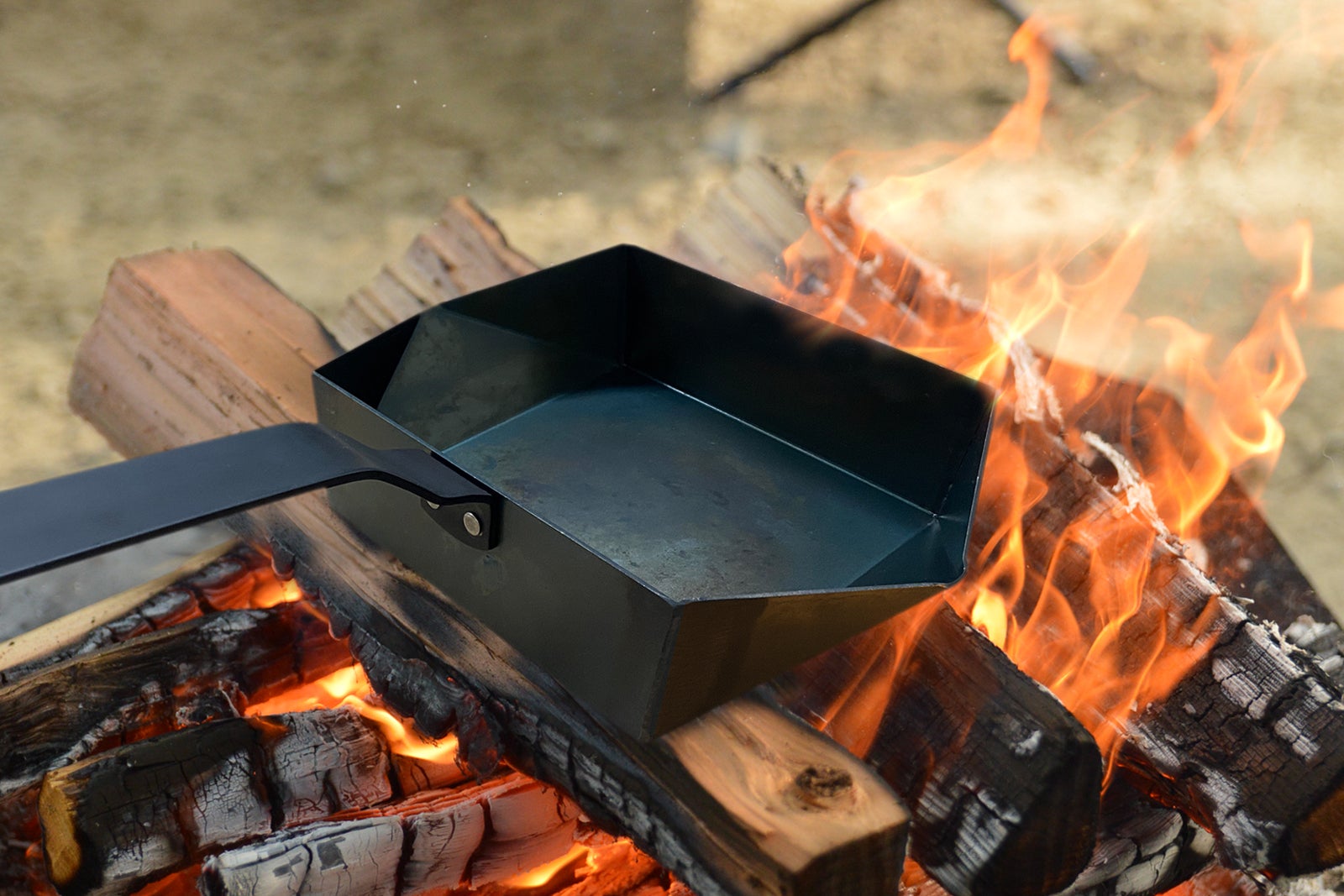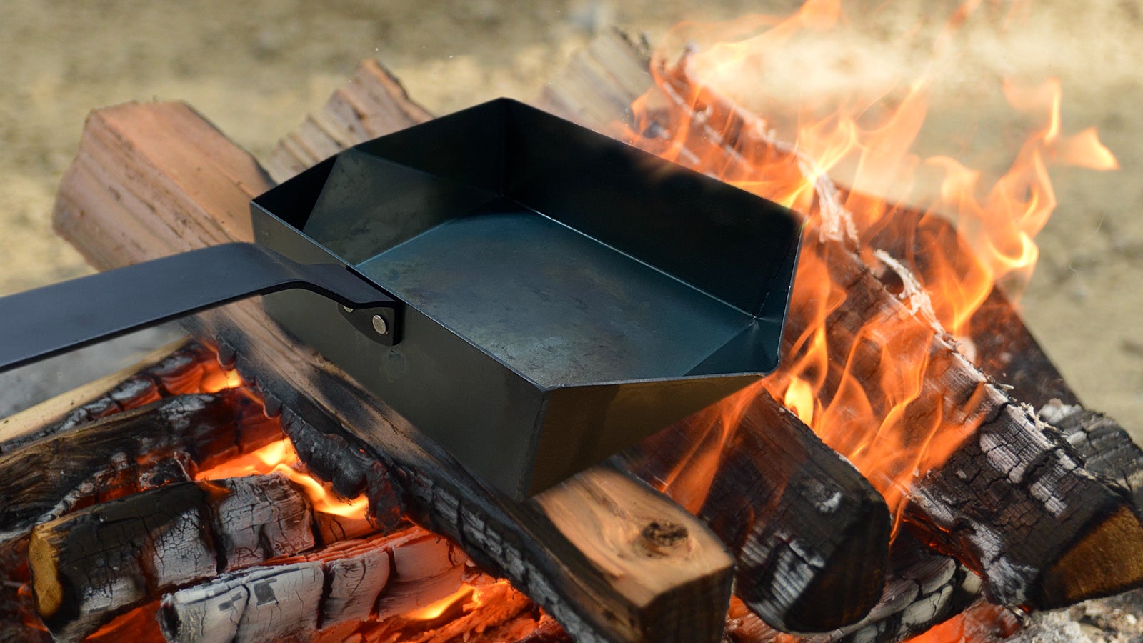 油をなじませて使い込んでいけば、油と熱により完全な皮膜が出来て、焦げ付きにくい素晴らしい道具になります。鉄分が自然に摂取できるのも、この素材の特徴です。ほのかに青く光るような黒色と、無骨な素材感を味わえることも魅力です。