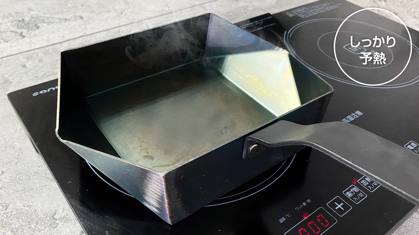 ご使用の前には、油をひく前にしっかり熱してください。 煙が上がってくるくらいによく加熱するのがポイントです。こうすることで、都度「酸化被膜」と呼ばれるものが表面に形成され、こびりつきの防止になります。一度火を止めて油をひいたら、弱火で十分に油をならしてから調理します。