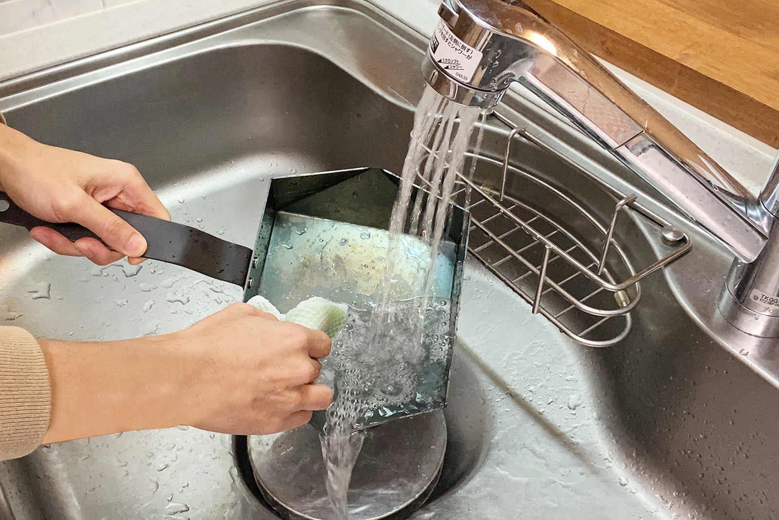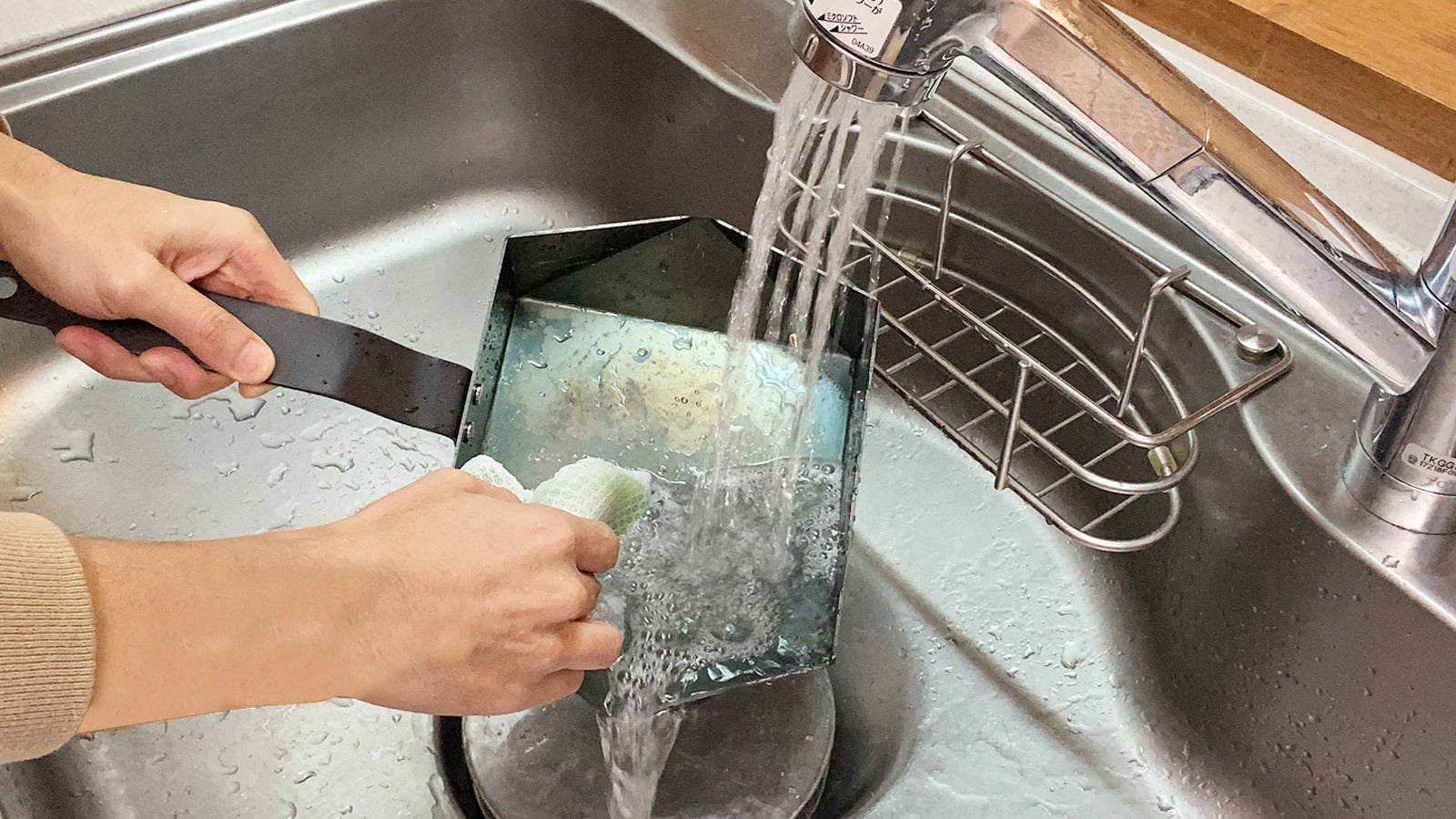 使用後は必要に応じて、水またはぬるま湯とタワシで洗います。洗剤を使っても大丈夫ですが、基本的に洗剤はいりません。もしもこびりついた汚れがある場合は、水を張ってしばらく加熱してから洗うと落ちやすいです。最後にさっと火にかけて乾かすだけ。