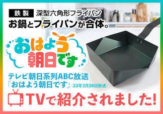 2022/06/09 14:38皆様いつも応援ありがとうございます。両利き用の優しい設計!コレ1つで料理が自由自在に!鉄製六角形フライパン 23cm。2022年2月28日(月)テレビ朝日系列 ABC放送「おはよう朝日です」の「けさのクローズアップ」のコーナーにて「鉄製深型六角形フライパン」が紹介されました!引き続き、ランドスケープをよろしくお願いいたします。 もっと見る