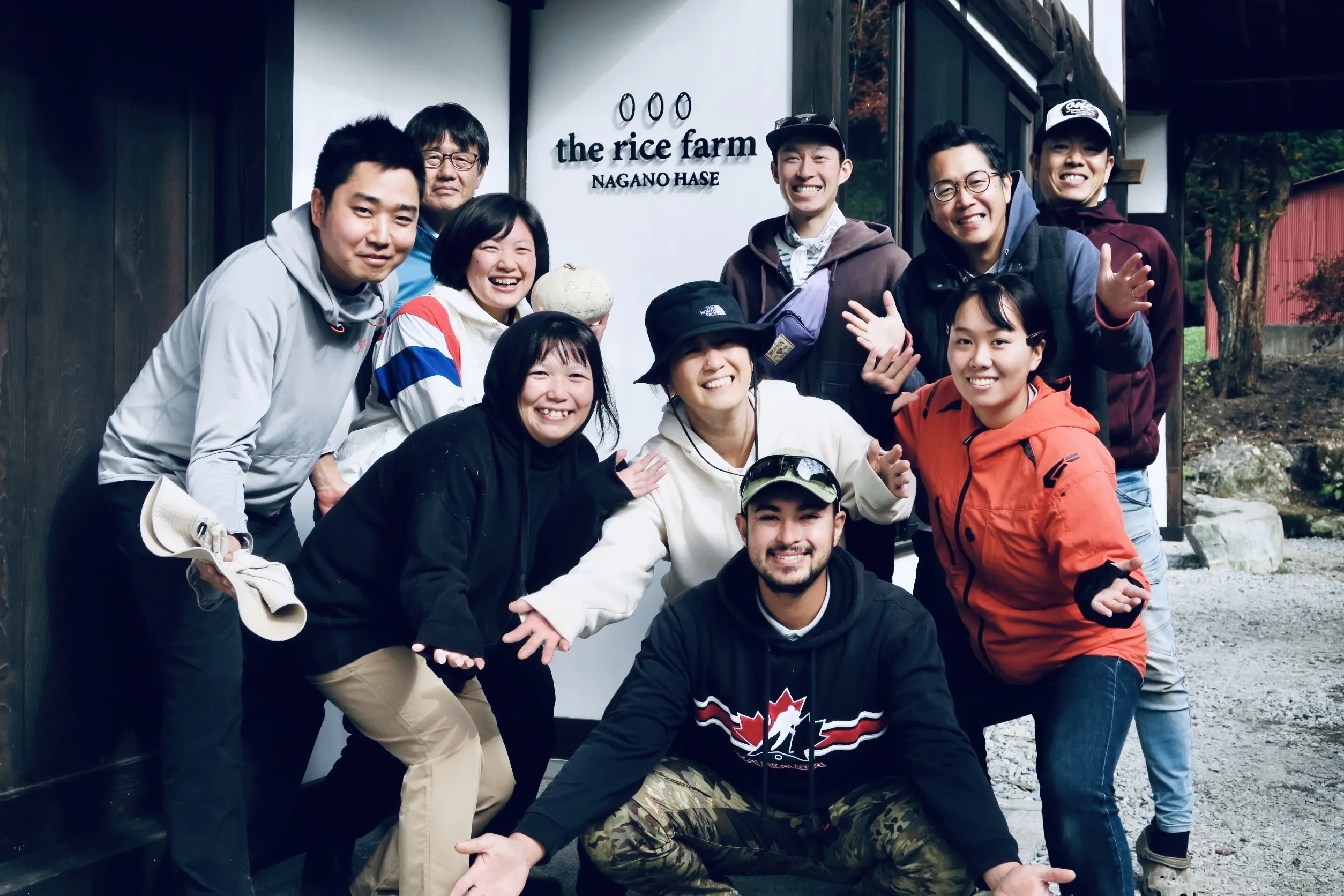 写真は古民家ひがしで、ザ・ライスファームのメンバーが記念撮影をした様子。