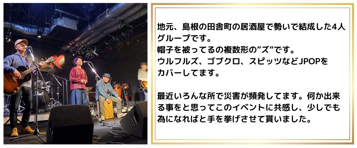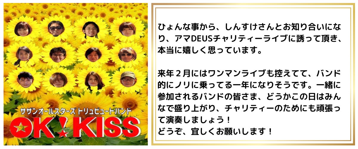音楽を通じて知り合った仲間とともに音楽を楽しみ、それが笑顔を生み出し、幸せがやってくる。たくさんのチャリティーライブを行う中で私が得てきた経験は何物にも変えられない体験だったと思っています。
