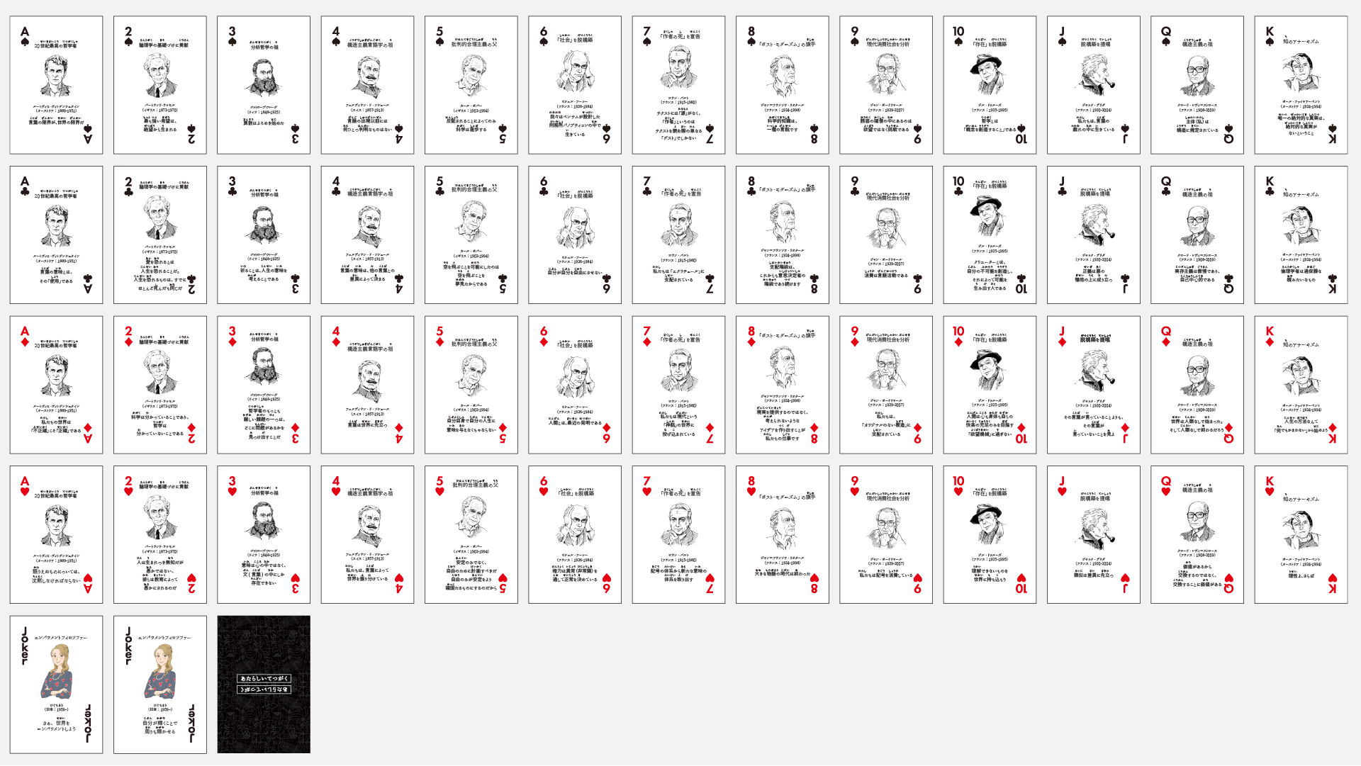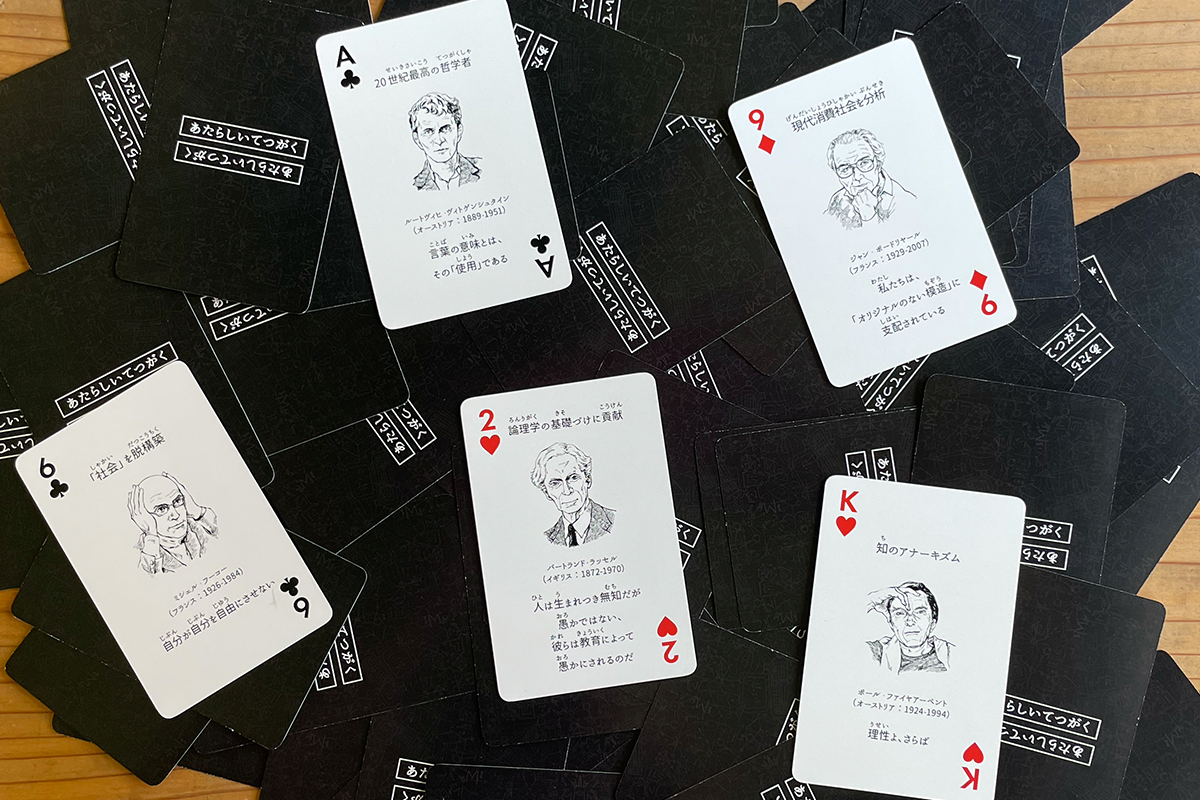 A1.哲学者トランプは、通常のトランプと同じように遊ぶことはできますが、遊ぶことを目的としていません。トランプに書かれてある哲学者の言葉に触れることで、まだ知らない世界を広げ、そこから新たな思考を生み出すことを目的にしたトランプです。
