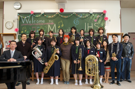 温かく迎えてくださった松島中学校を吹奏楽部のみなさんと一緒に記念写真。