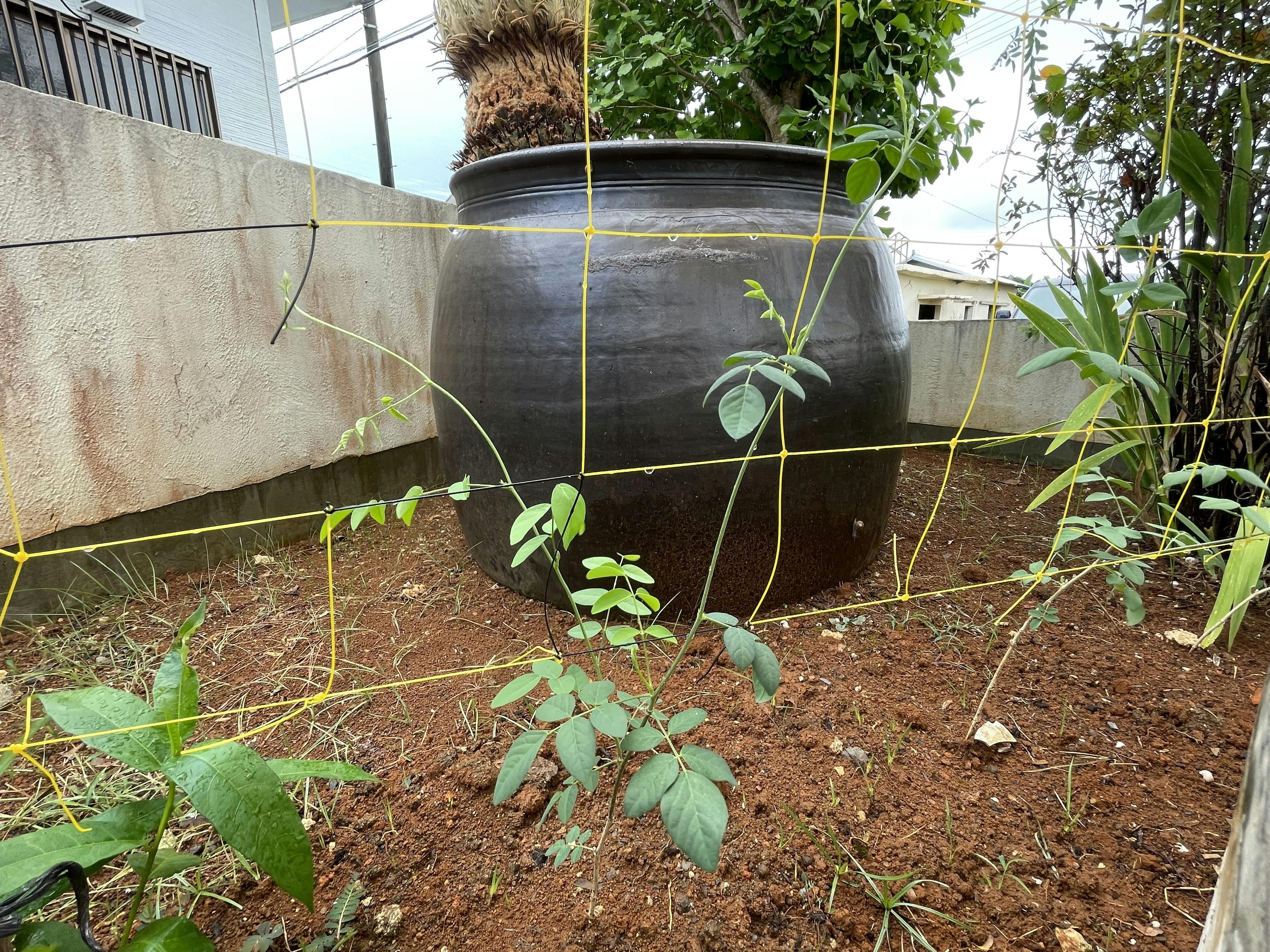 松永酒造場の庭にバタフライピーとローゼルの苗を植えました。