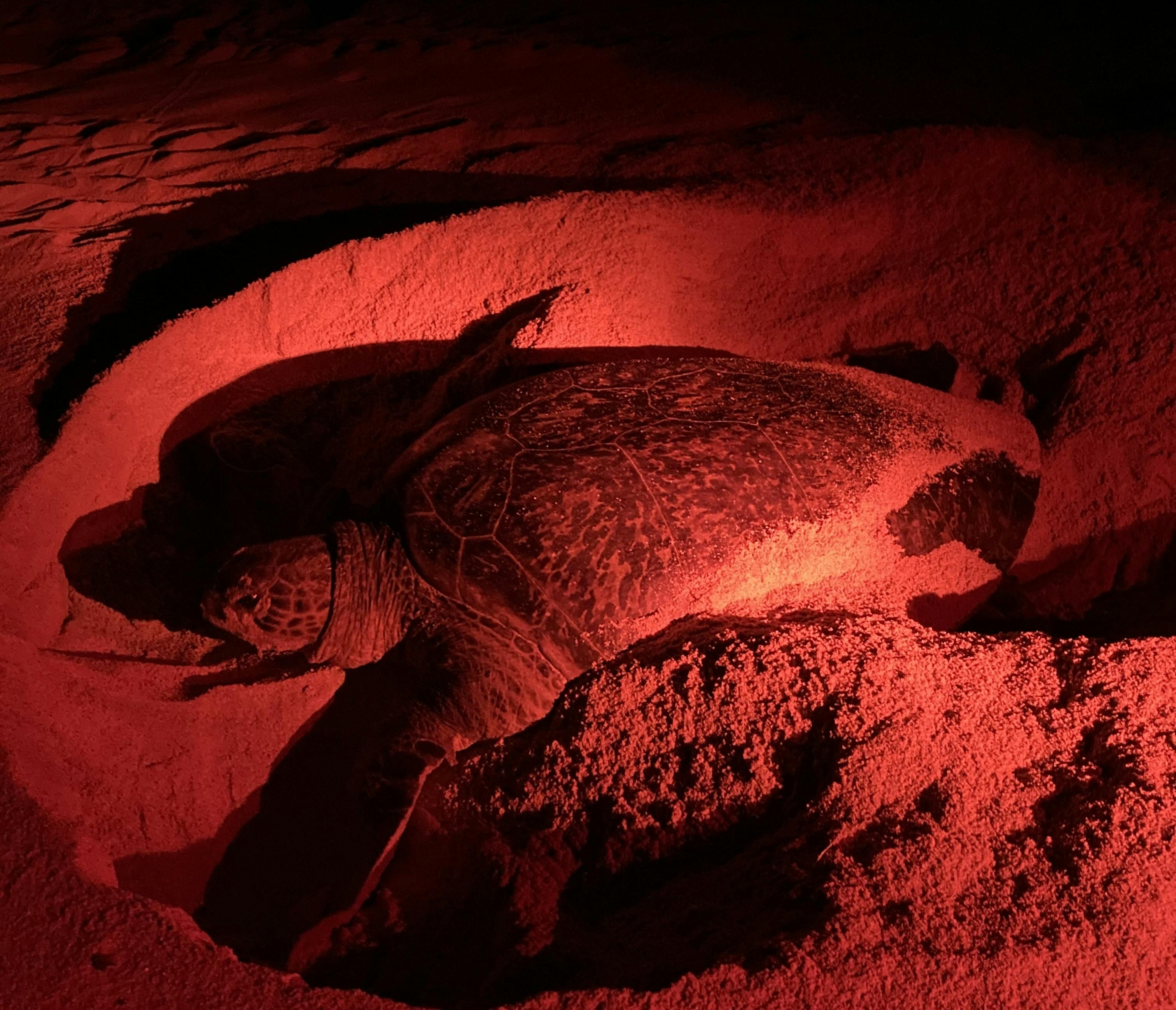 去年の8月14日、産卵の為にに上陸したウミガメを撮影した1枚!(ウミガメが認識できない赤いライトで照らしています。)