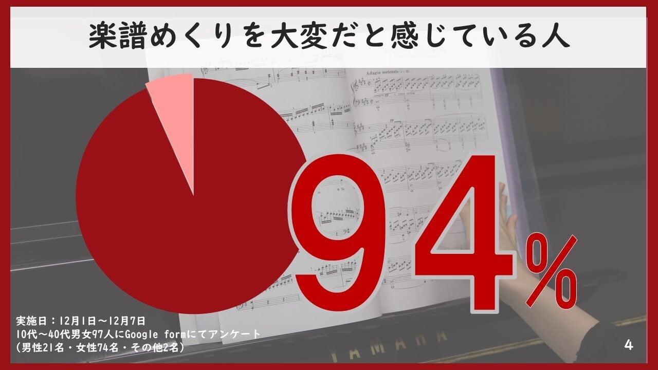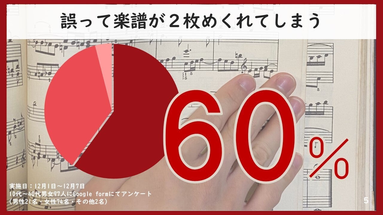 なんと94%もの人が楽譜をめくる事に対して悩みを持っていることがわかりました!