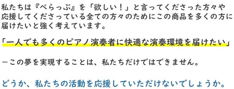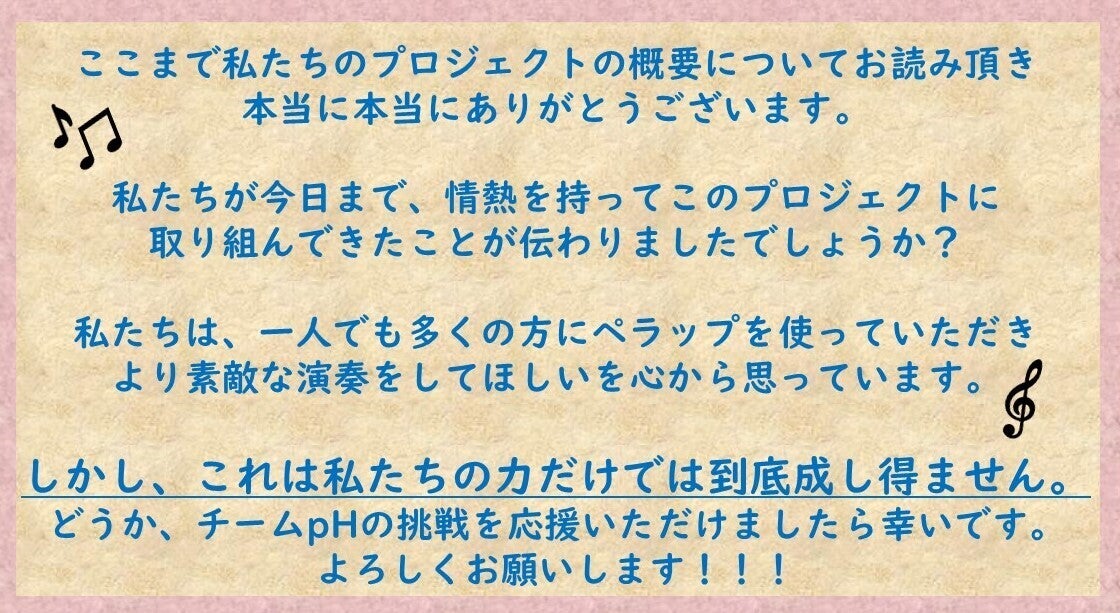 2022/08/29 19:00こんにちは!法政大学経営学部のチームpHです!夏も終わりが近づき、涼しい風が吹く日もありますね…!さて、7月末に始まったこのクラウドファンディングのプロジェクトもいよいよ終わりが見えてまいりました。これまでご支援いただいた皆様、本当にありがとうございます…!この1週間のとりくみに関しまして、まずはずっと続けている「毎日ぺらっぷ」企画について書いていこうと思います!今週作成したコピーをいかにまとめました!先週同様、メンバー間で熟考して作りだしたコピー案達です!この中からいくつか、メンバーが制作する過程で面白い!と思ったコピーを実際に行われた会話形式で解説します!ーーーーーーーーーーーーーーーーーーーーーーーーーーーーーーーーーーーーーーーーーーー【Day23 / Load me!】齊藤:こりゃー一体何のQRコードなんだ…?深山:人に聞く前に自分でやってみなさい(笑)齊藤:どれどれ…。お!これは! ……圧を感じますな(笑)深山:圧を出してるわけじゃなくてお願いしてるだけです!!是非皆さんも一度読み込んでみてくださいね♪ーーーーーーーーーーーーーーーーーーーーーーーーーーーーーーーーーーーーーーーーーーー【Day26 / 気が付くって大切だ】齊藤:間違い探しなら昔から得意よ!!さてこれはどういうことなのでしょう桝田の姉貴!桝田:さてこの画像、明らかになんか違和感あるよね…?みんなは何に気付いた?深山:うーん、リモコンをテレビじゃない方向に向けてるとか?桝田:えっ、確かに。それも変だわ。齊藤:(そこじゃないのか…)桝田:この赤ちゃん、なんか怖いと思わない…?平田:えっホラー系ですか!?予想外なんだが…。さて、みなさんはわかりましたでしょうか?ヒントは赤ちゃんの顔に注目!さて!今週の「毎日ぺらっぷ」はいかがでしたでしょうか?皆さんも気になったコピーがあったら是非教えてくださいね!この企画もあと二日で終了!最後は何が飛び出してくるのでしょうか…!これを書いている齊藤自身も楽しみです…!ーーーーーーーーーーーーーーーーーーーーーーーーーーーーーーーーーーーーーーーーーーーさて、今週はもう一つ大きな活動をしてきました!ピアニストであり、現在はピアノ教室や株式会社URAHAKUの取締役も務めていらっしゃる松岡優明(まつおか ゆうま)先生の教室に訪問させていただき、ぺらっぷを試用いただいたり、様々なお話を伺ったりしてきました!松岡先生からは「コンクールでの勝ち負けにこだわりすぎず、心からピアノを楽しんでほしい」という心のこもったお話も頂き、私達もそのような思いを一人でも多くの方々に届けたい!と改めて感じさせていただきました…!また、実際にぺらっぷを巧みに試用して頂きながらドビュッシーの名曲を演奏いただきました!本当に心温まる演奏でぺらっぷを試用いただいていることを忘れそうなほど聞き惚れてしまいました…(笑)松岡先生、ありがとうございました!▼松岡優明先生の教室のサイトはこちらからご覧になれます♪▼https://matsuoka-music-school.com/news-2/ーーーーーーーーーーーーーーーーーーーーーーーーーーーーーーーーーーーーーーーーーーー〇クラウドファンディング終了に向けて、最後のお願いさて、1か月にわたって私たちはクラウドファンディングを続けてまいりました。私達の想像よりはるかに多くの方々からご支援を頂き、何とか商品の流通に向けて動き出すことが出来そうになっております。本当にありがとうございます。しかし、まだ残りの期間、一人でも多くの方に私たちの商品に出会ってほしいと思っています!この一週間では、SNSにおいて「すごく良いアイデアの商品なのでぜひ製品化されてほしい!」「めっちゃ欲しい!」といった本当にありがたいお言葉もいただけています。私達はそのようなお言葉を頂けることが心から嬉しいですし、そのような方々がぺらっぷを使って演奏を楽しんでくださることが何よりも嬉しいです。何卒私たちのこの活動に、最後のご支援を頂けますと幸いです!是非よろしくお願いします!!チームpHでした! もっと見る【プロジェクト開始から3週間!】『毎日ぺらっぷ』企画&試用用ぺらっぷのスタジオ設置について