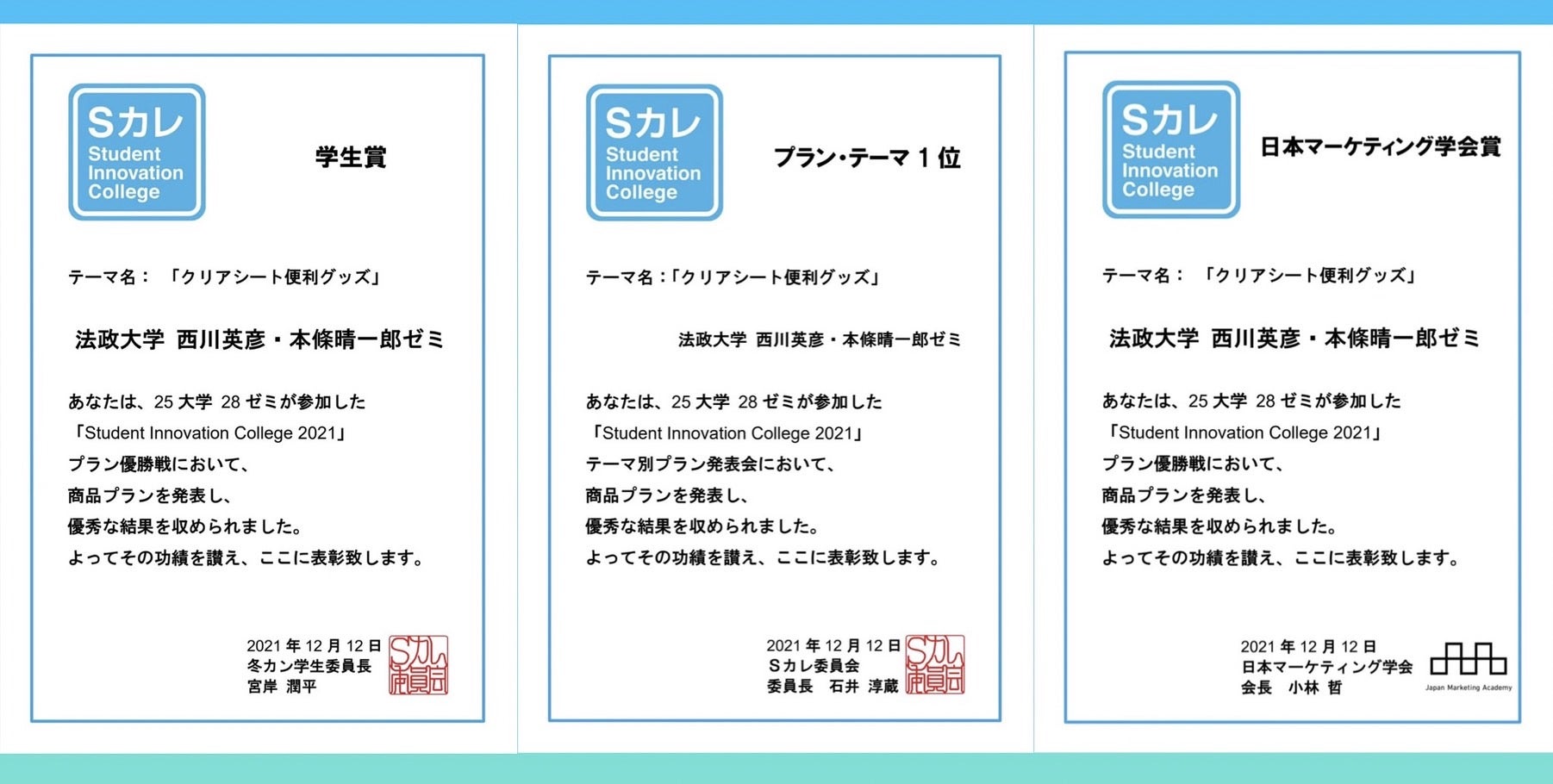 またそれだけでなく、私たちの商品プランに対する熱意と、そのための地道な研究が功を奏し、「日本マーケティング学会賞」と「学生賞(学生が選ぶ第一位)」にも選出して頂き、結果としては三冠を獲得しました。