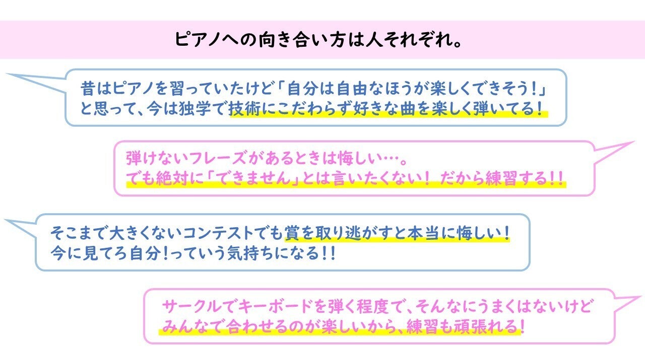 私たちはこのようなピアノ演奏者の皆さまの気持ちに、努力に、心を打たれました。