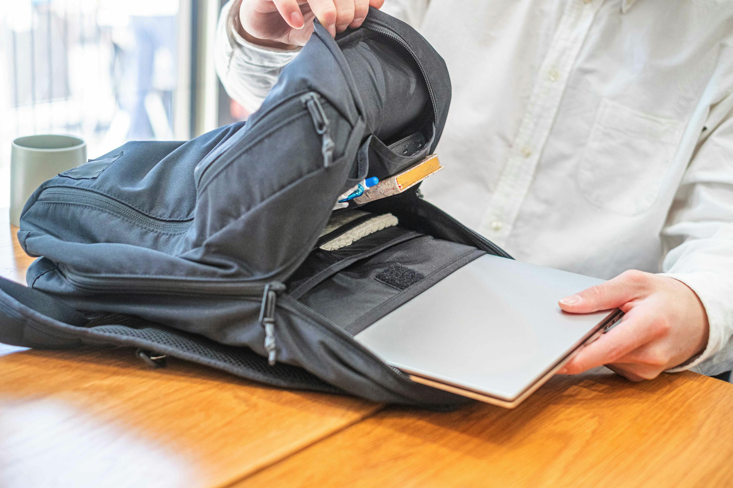 さらに片側が大きく開く構造なので、PCへのアクセスは非常にスムーズ。オフィスやカフェに到着したら、サッとすぐに取り出しが可能です。