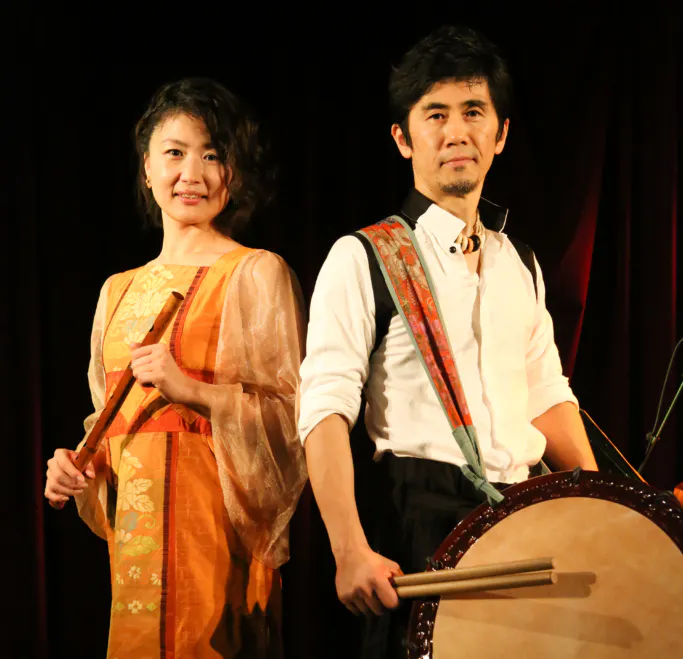 佐渡の和太鼓芸能集団「鼓童」から独立し、角松敏生や吉田兄弟など様々なアーティストのサポートを手がけ、巧みな技術で独自の和太鼓音楽を構築する内藤哲郎と、幼少より江戸祭り囃子を習得し、能楽師笛方に師事するなど古典芸能をベースとしたオリジナル作品を生み出す篠笛・能管奏者の武田朋子によるDUO。