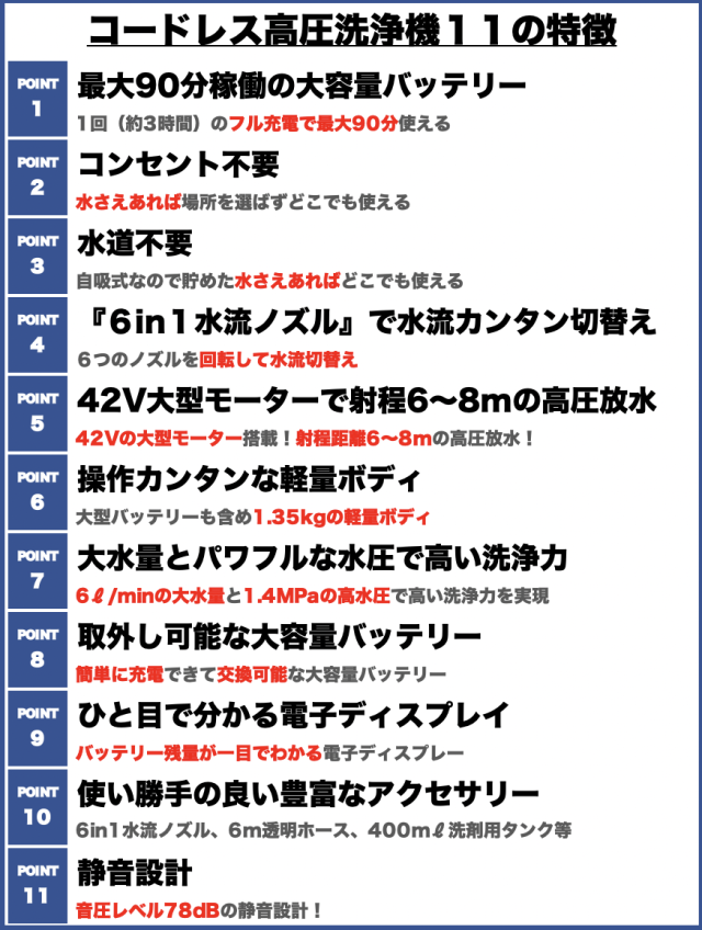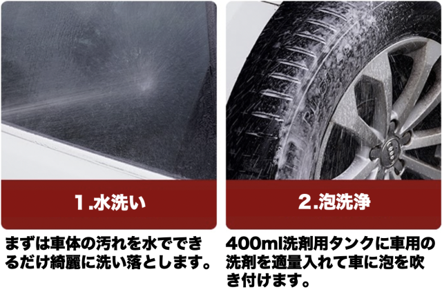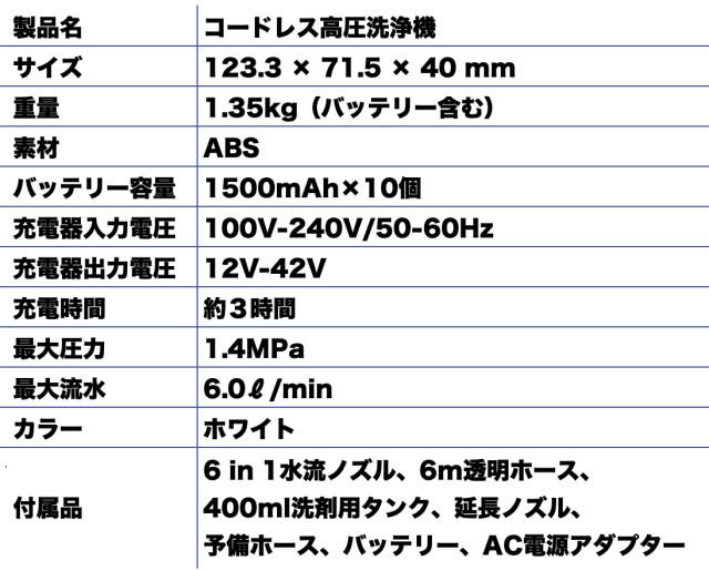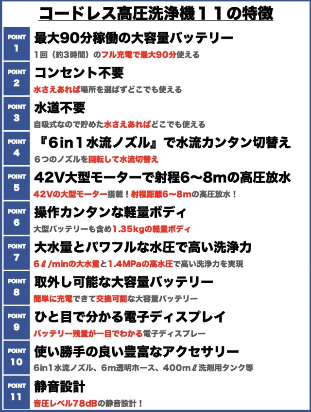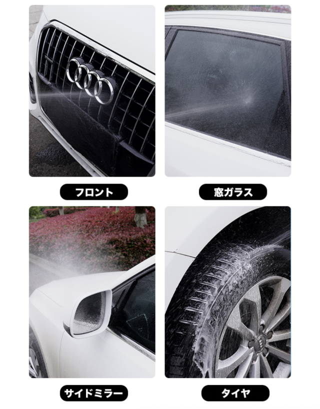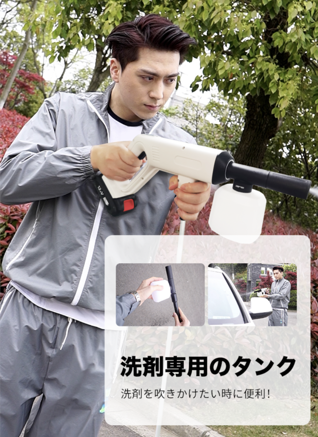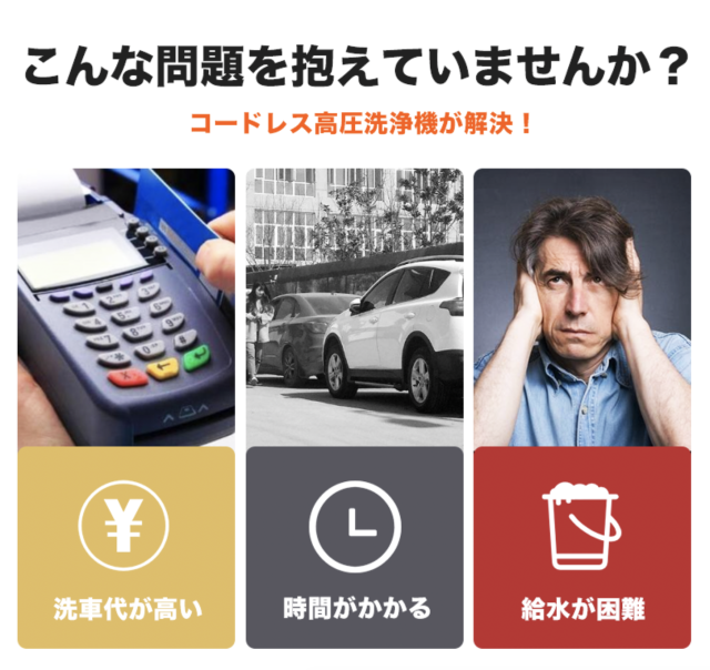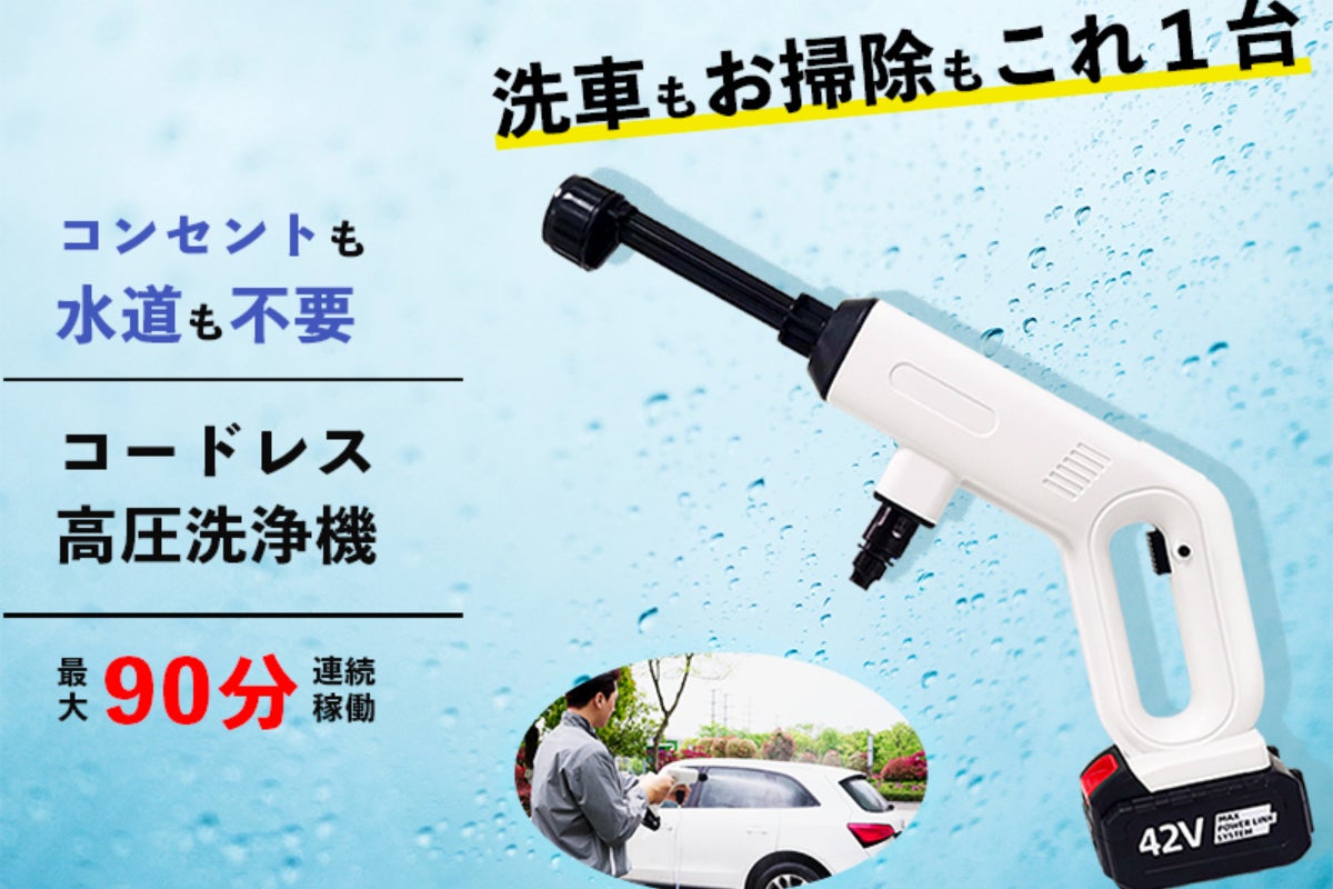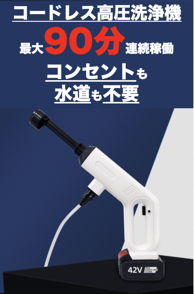 そんな「時間」も「お金」も大切にしたいあなたにお薦めしたいのが「コードレス高圧洗浄機」です。「コンセントも水道も不要」なので、いつでも・どこでも・すぐに・簡単に・洗車することができます。しかも最大90分連続稼働のパワフルさです。