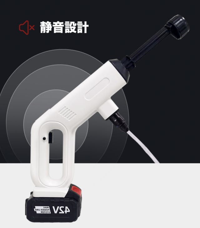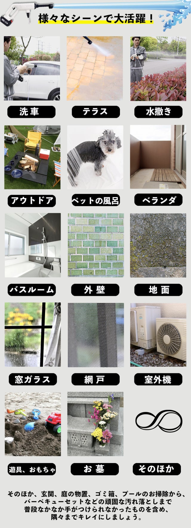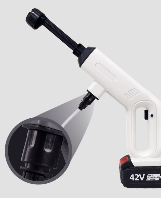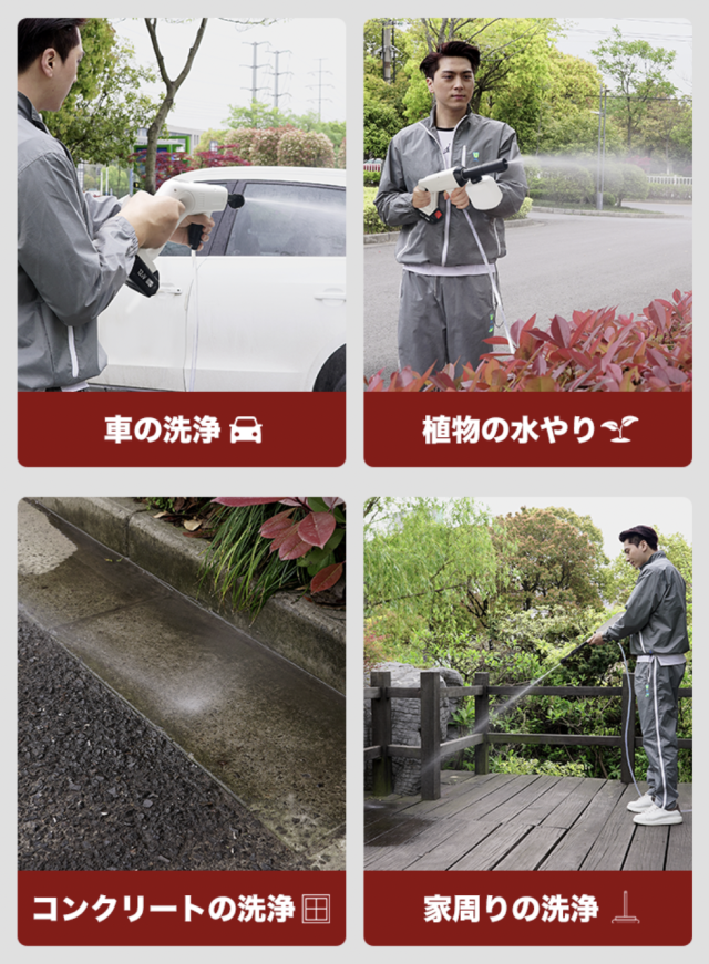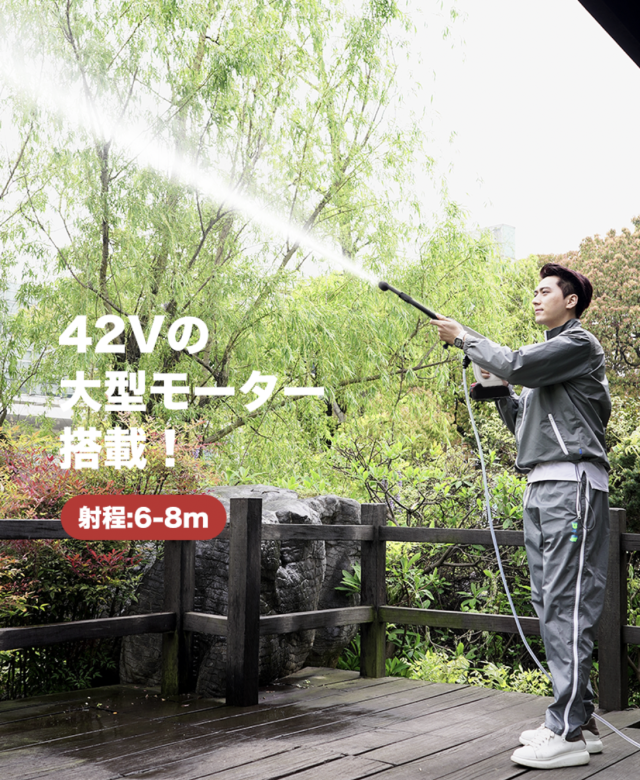 42Vの大型モーターを搭載しており、「最大90分の連続稼働」や「射程距離6〜8mの高圧放水」を実現しました。洗車だけではなく、ご自宅のベランダやガレージの洗浄、庭や畑の植物への水やりなど、様々な場所でご活用いただけます!