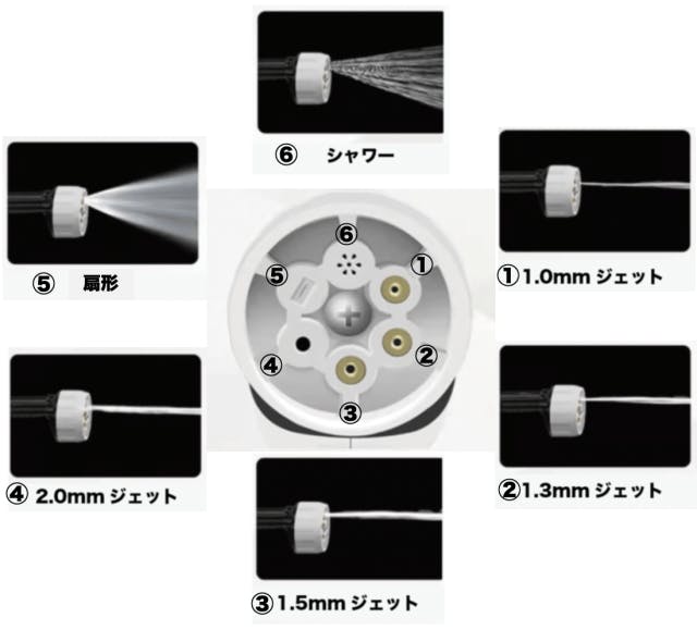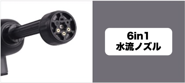 6種類の水流をノズルを回転して自由に切り替えられる「6in1水流ノズル」が付属します。洗浄する場所や車の部位に応じて効率的な放水が可能です!