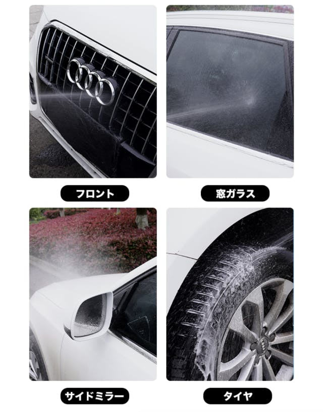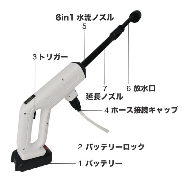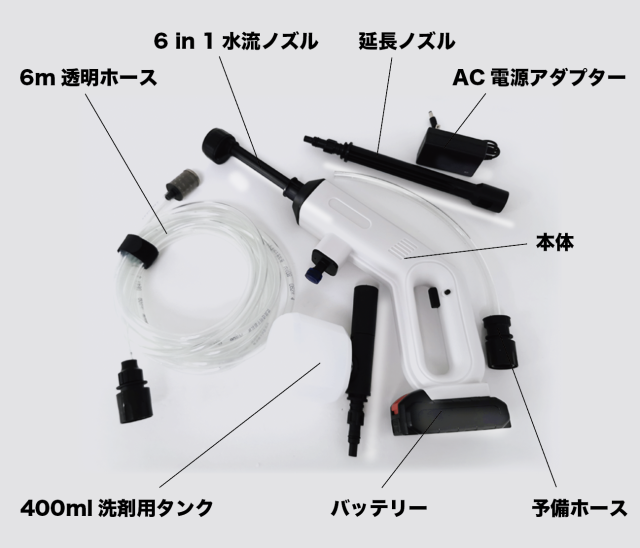 6in1水流ノズル、6m透明ホース、400mℓ洗剤用タンク等