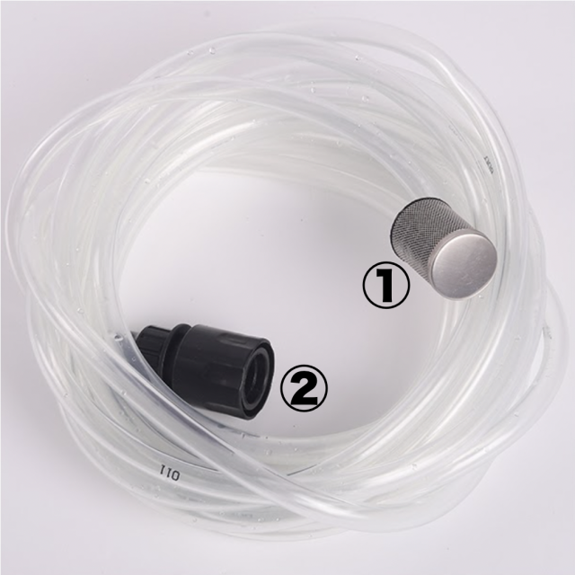 本商品は、吸水口のフィルター(①)と本体のニップルコネクタフィルター(②)によって、水の中に含まれる不純物を分離し、車に傷をつけない2重のフィルター構造を採用しています。 河や池などの濁った水を使用する際は、2重のフィルターでも除去しきれない細かい砂泥等が混じる場合があり、車の損傷につながる可能性があるため、ご使用をお控えください。