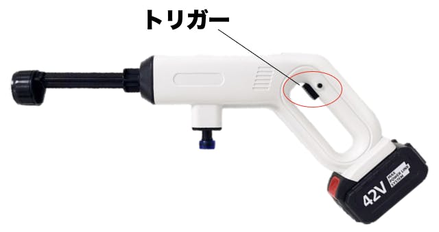 本体にある黒色の「トリガー」を押すと水の吸い上げが始まります。ホースの水が本体側まで到達したら高圧の水が噴出し始め、お使いいただけます。